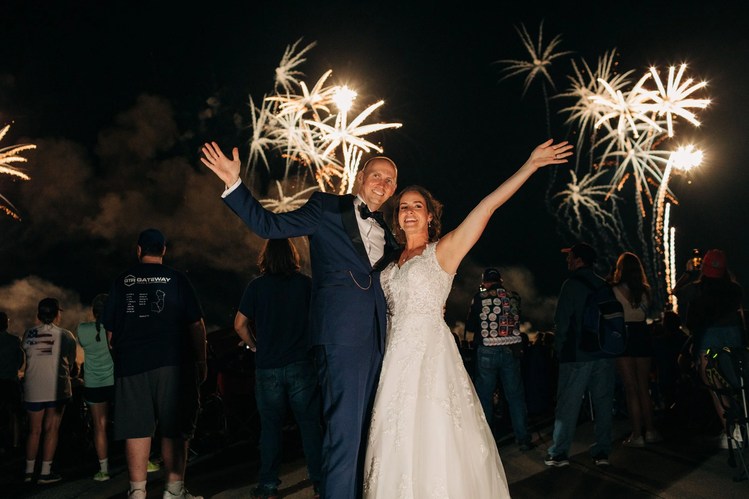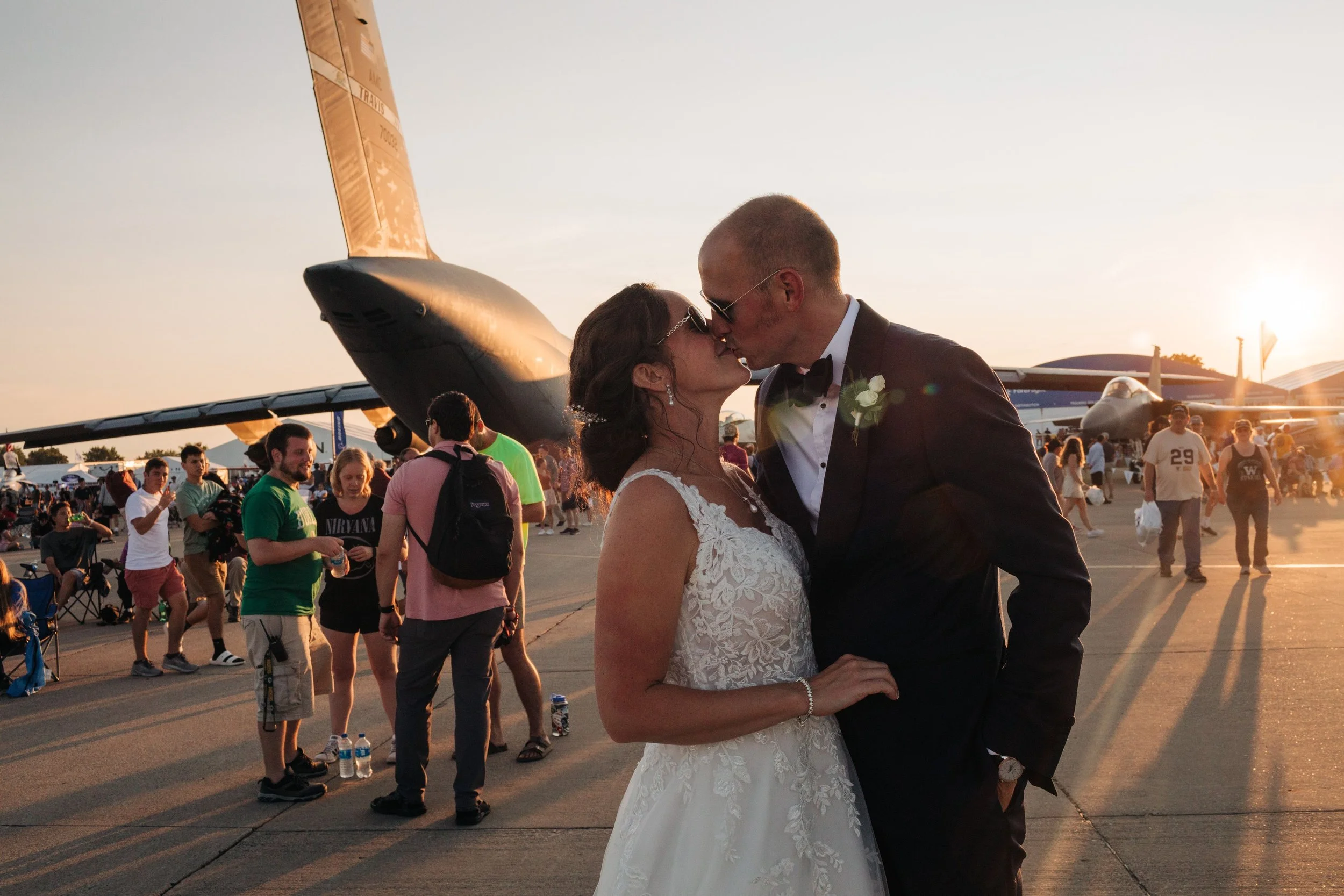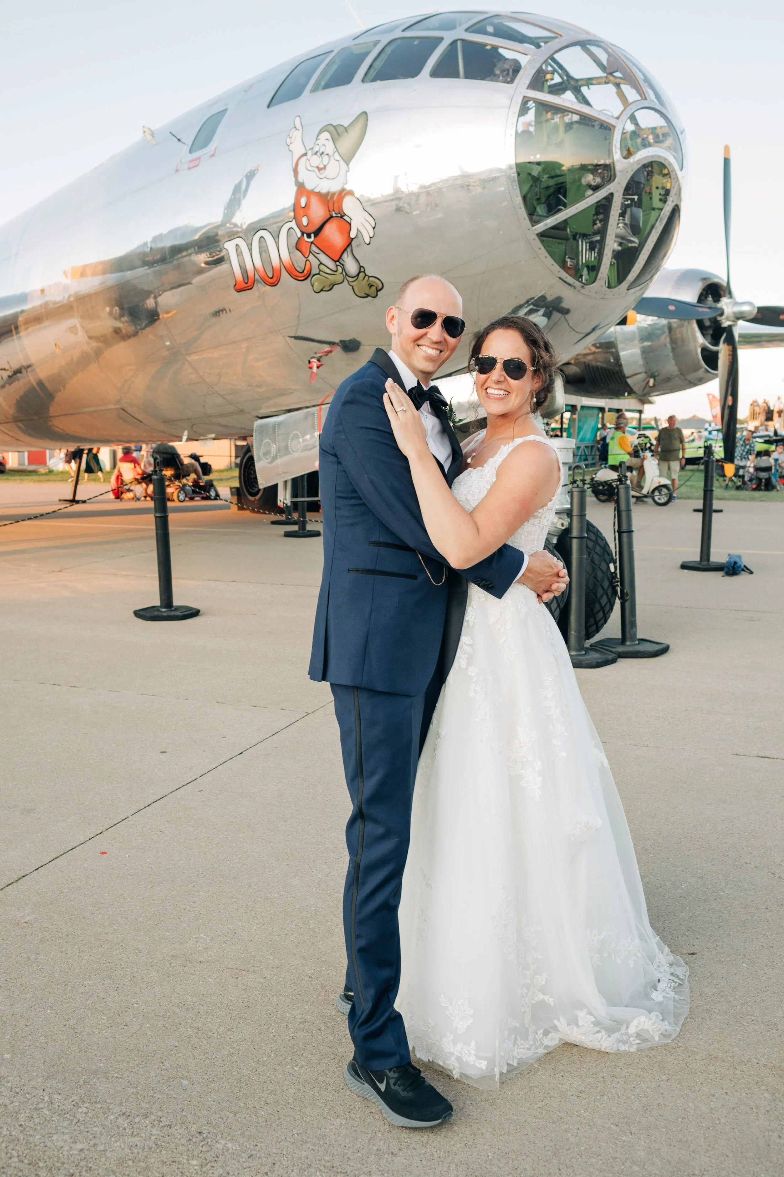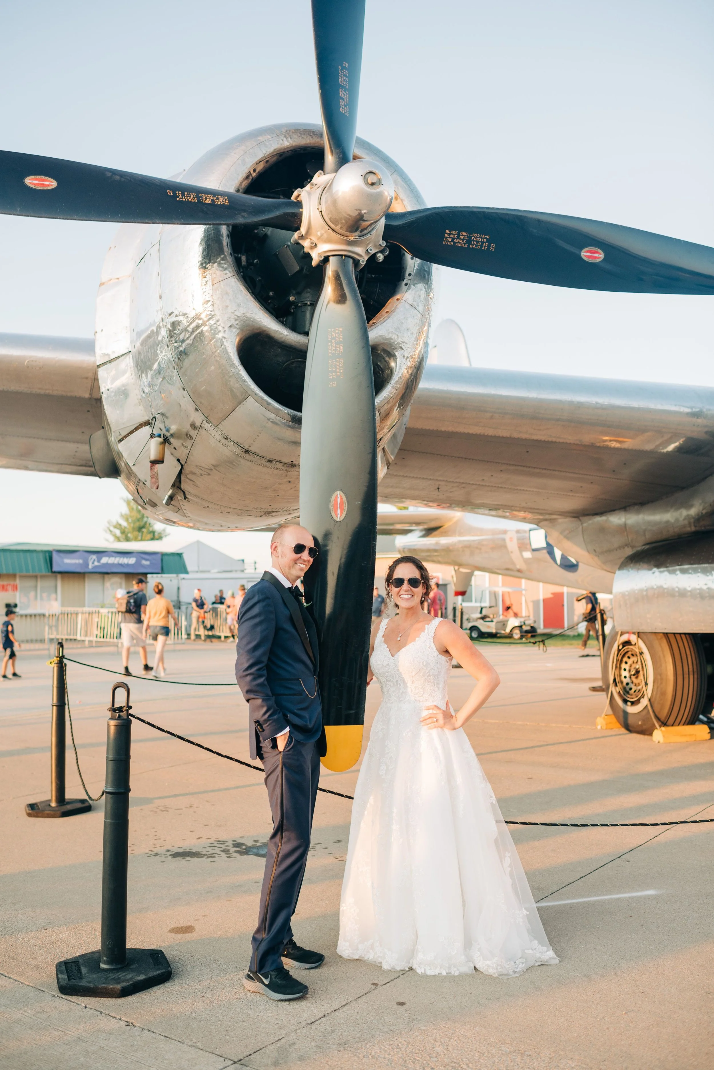 Kerri and Jake go to EAA AirVenture every year and it’s such a special part of their love story, so they wanted to share it with all of their loved ones. This was a destination wedding for everyone, including the two of them. After dinner, all 50 guests loaded onto a coach bus and as a group headed over to EAA AirVenture to watch the night airshow and fireworks. It was incredible!