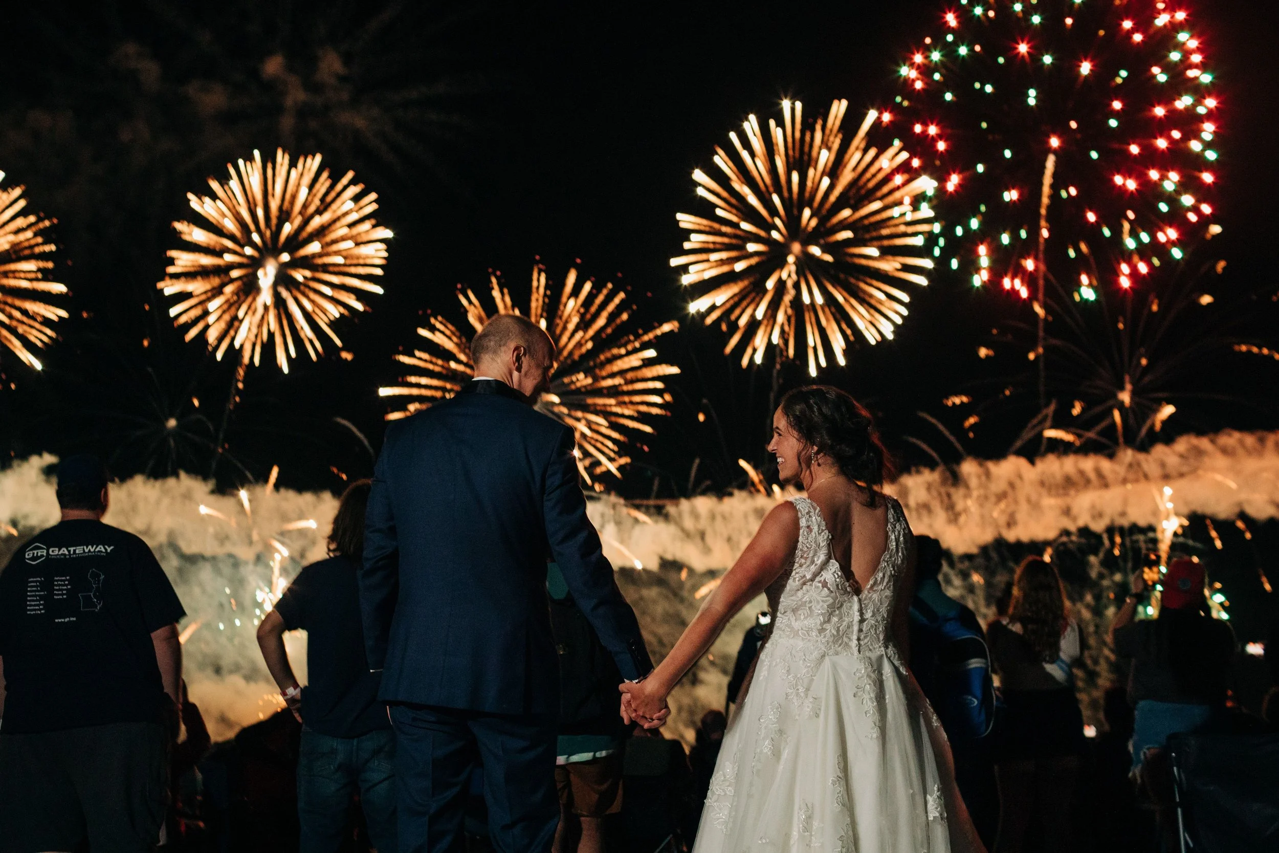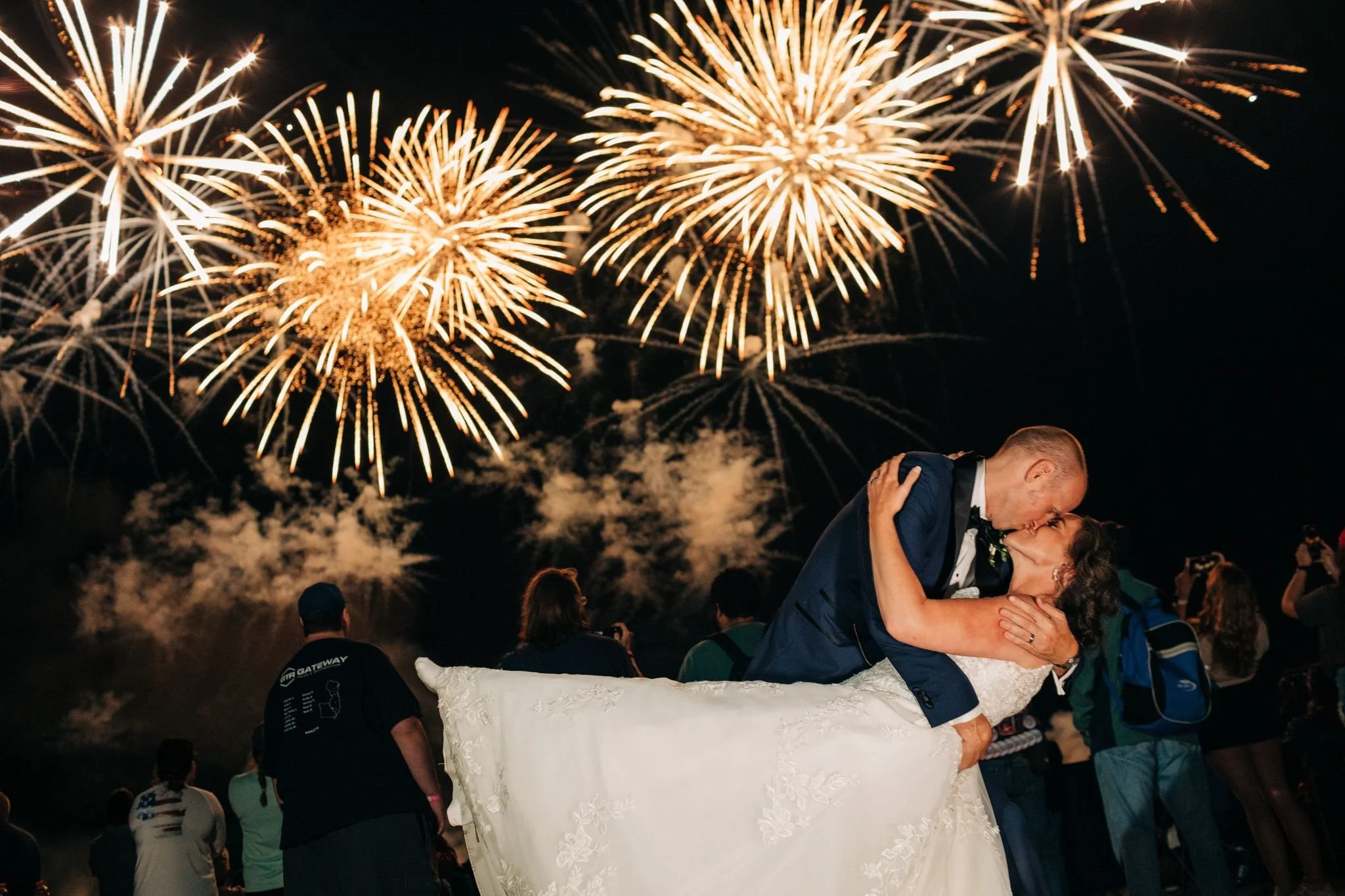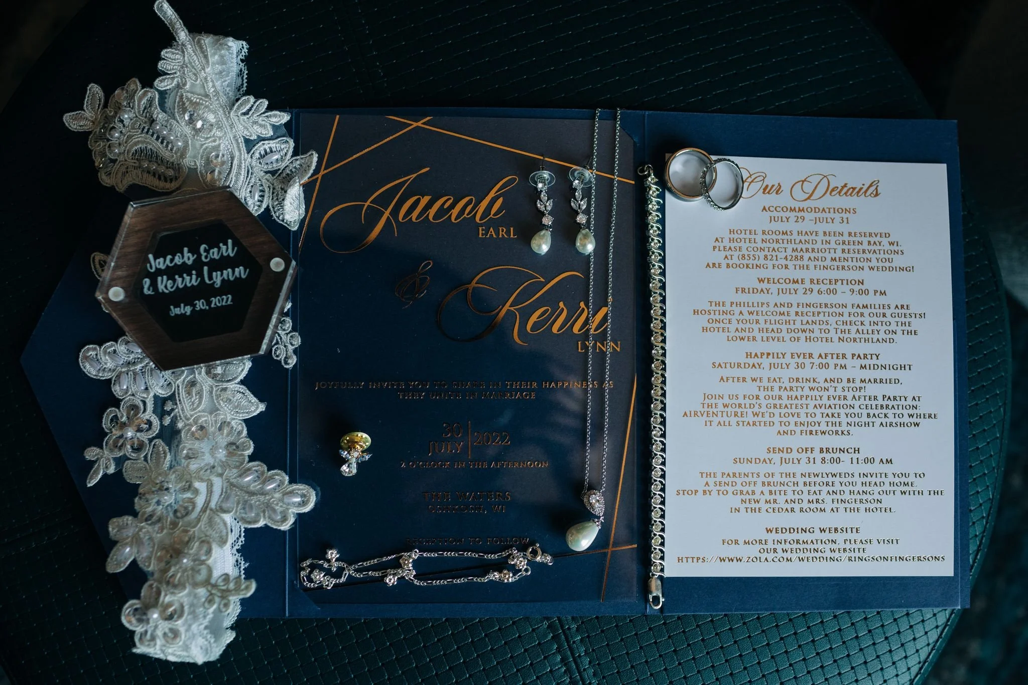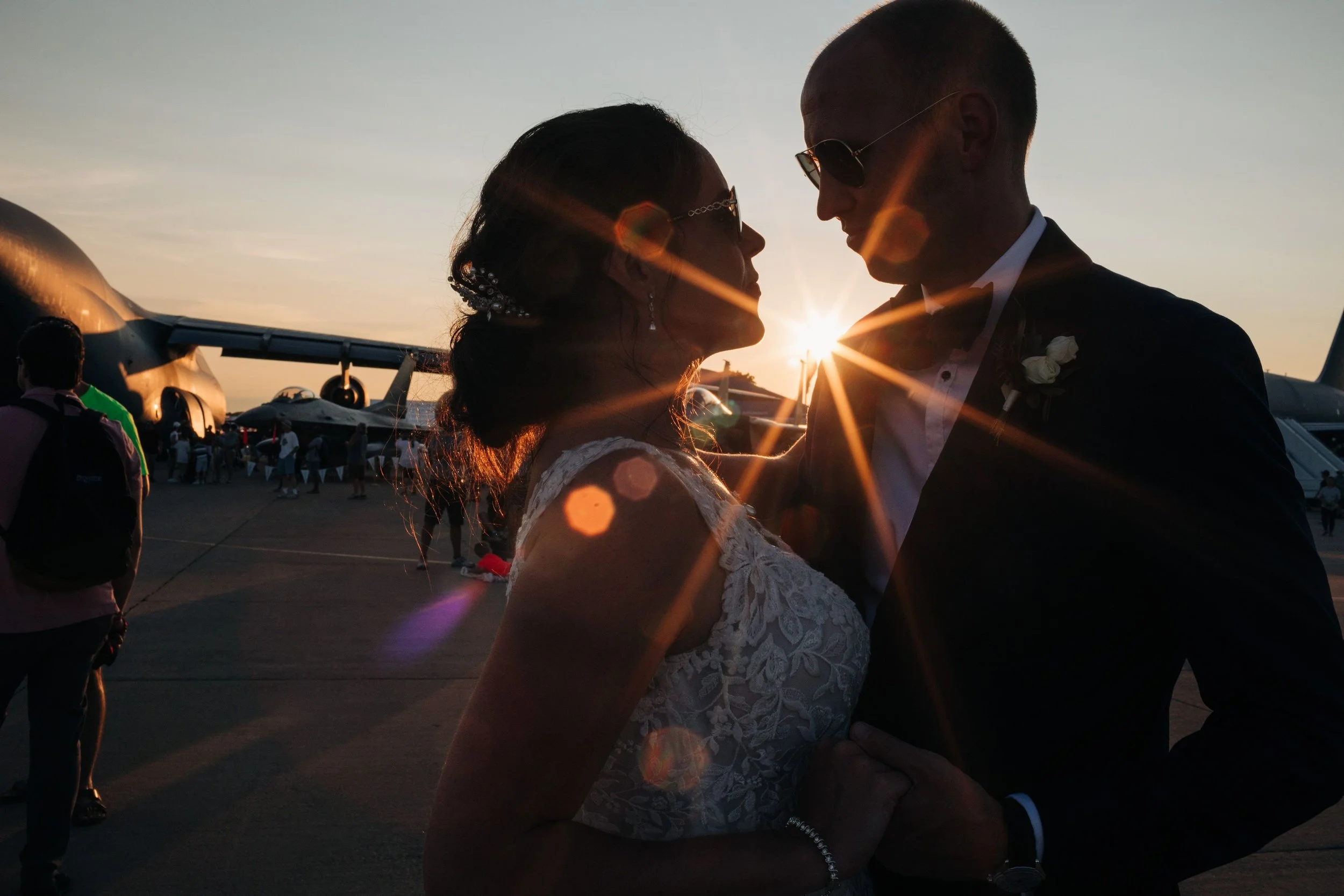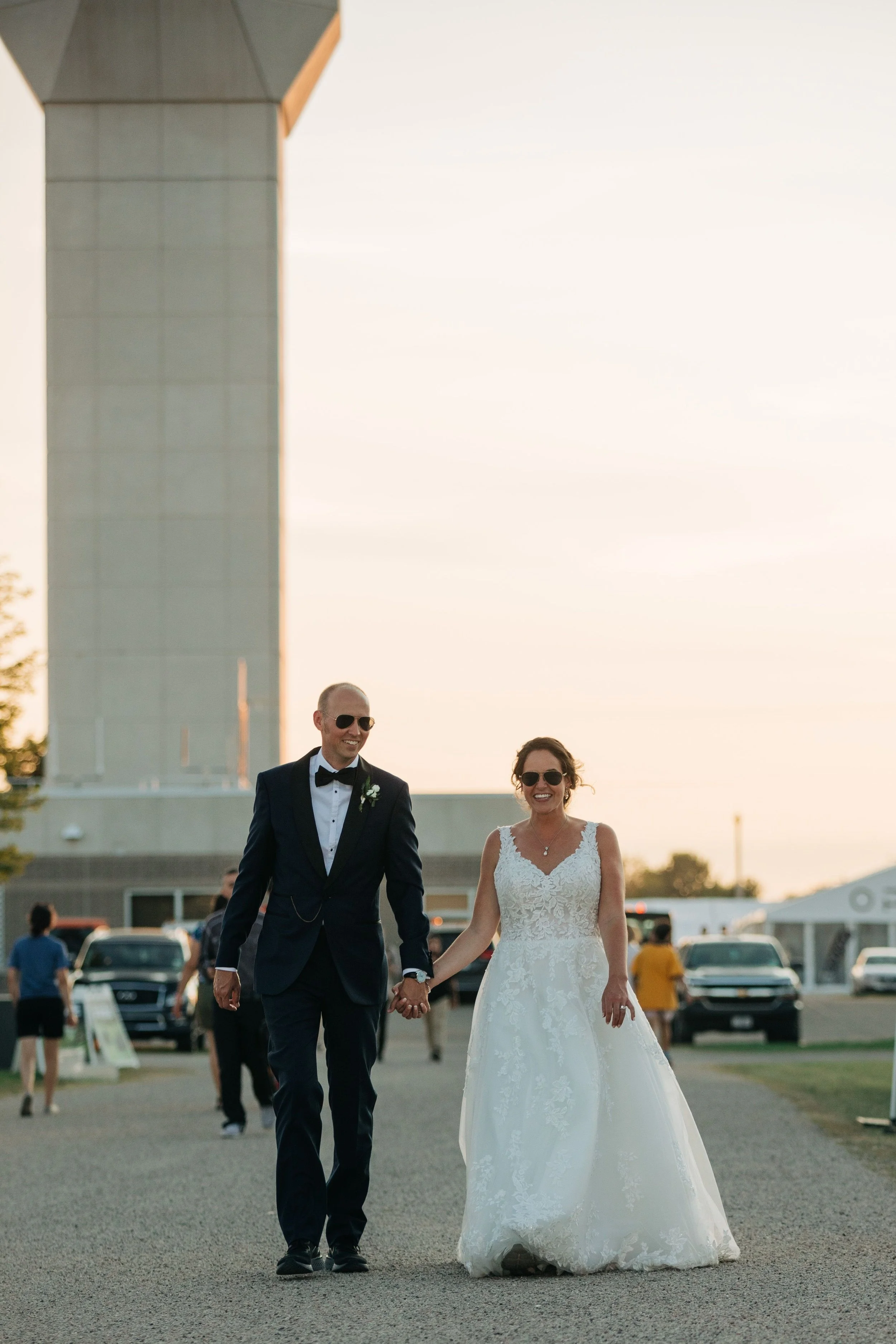 Kerri and Jake go to EAA AirVenture every year and it’s such a special part of their love story, so they wanted to share it with all of their loved ones. This was a destination wedding for everyone, including the two of them. After dinner, all 50 guests loaded onto a coach bus and as a group headed over to EAA AirVenture to watch the night airshow and fireworks. It was incredible!