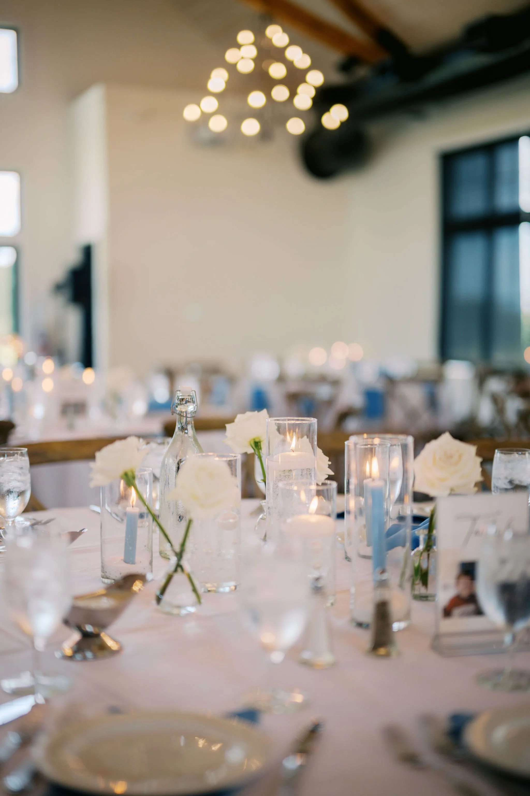 After photos they joined cocktail hour with their loved ones. The reception space was beautifully decorated with more white flowers and blue accents. Romantic candlelight and fun personalized table numbers completed the table decor. For dessert they had a cute heart shaped cutting cake along with a dessert table featuring a variety of Nothing Bundt Cakes.