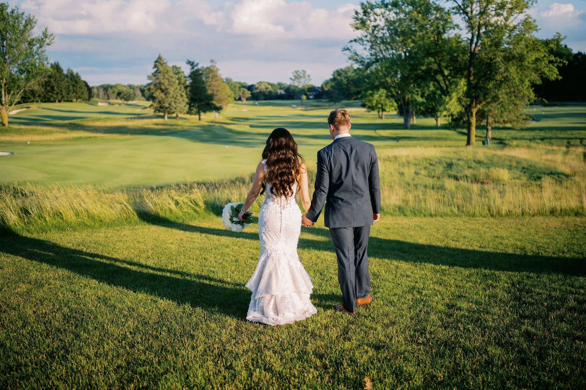 Latsami and Collin’s Carriage House at Lac La Belle wedding was a gorgeous summer day. It featured a color palette of classic white with a range of blue hues. The couple began their day with a first look and shared private vows together. The ceremony setup was absolutely breathtaking! It featured white pillars with statement florals along with a stunning floral arch as the main focal point.
