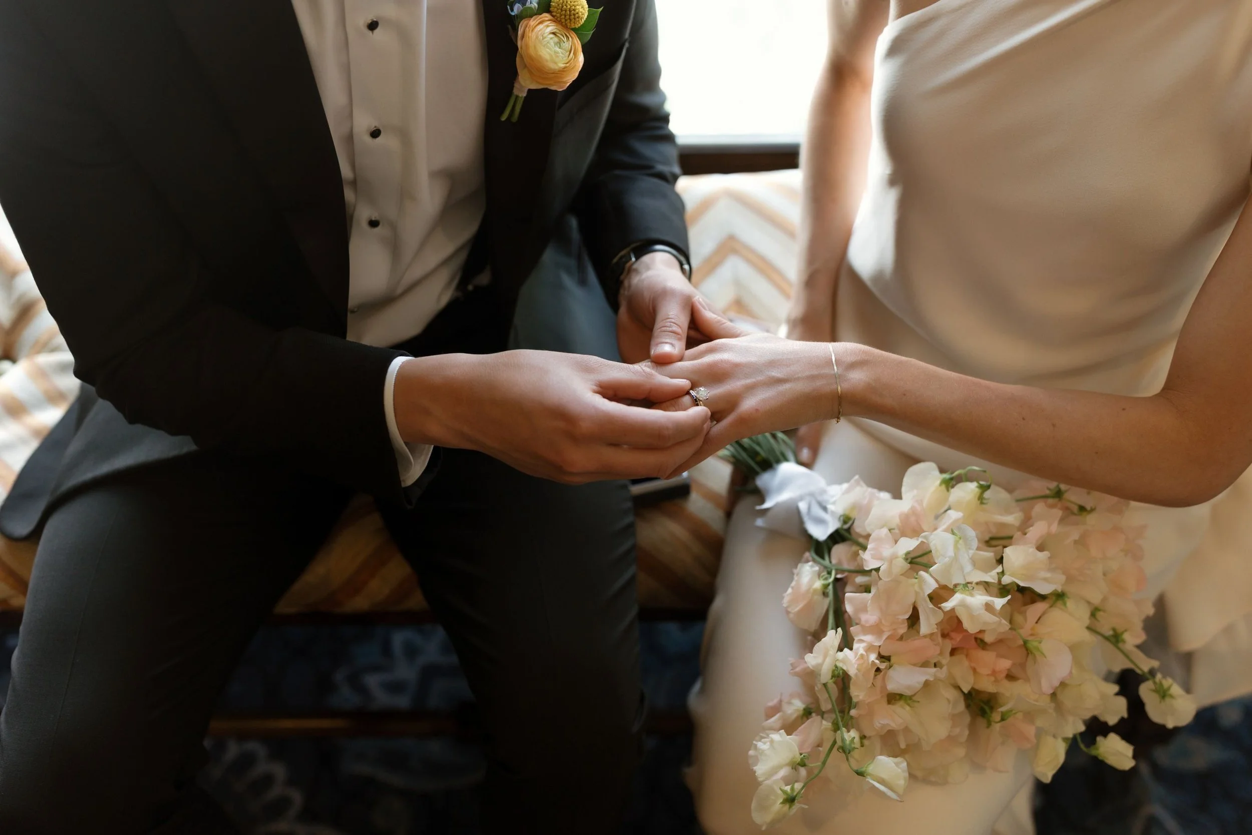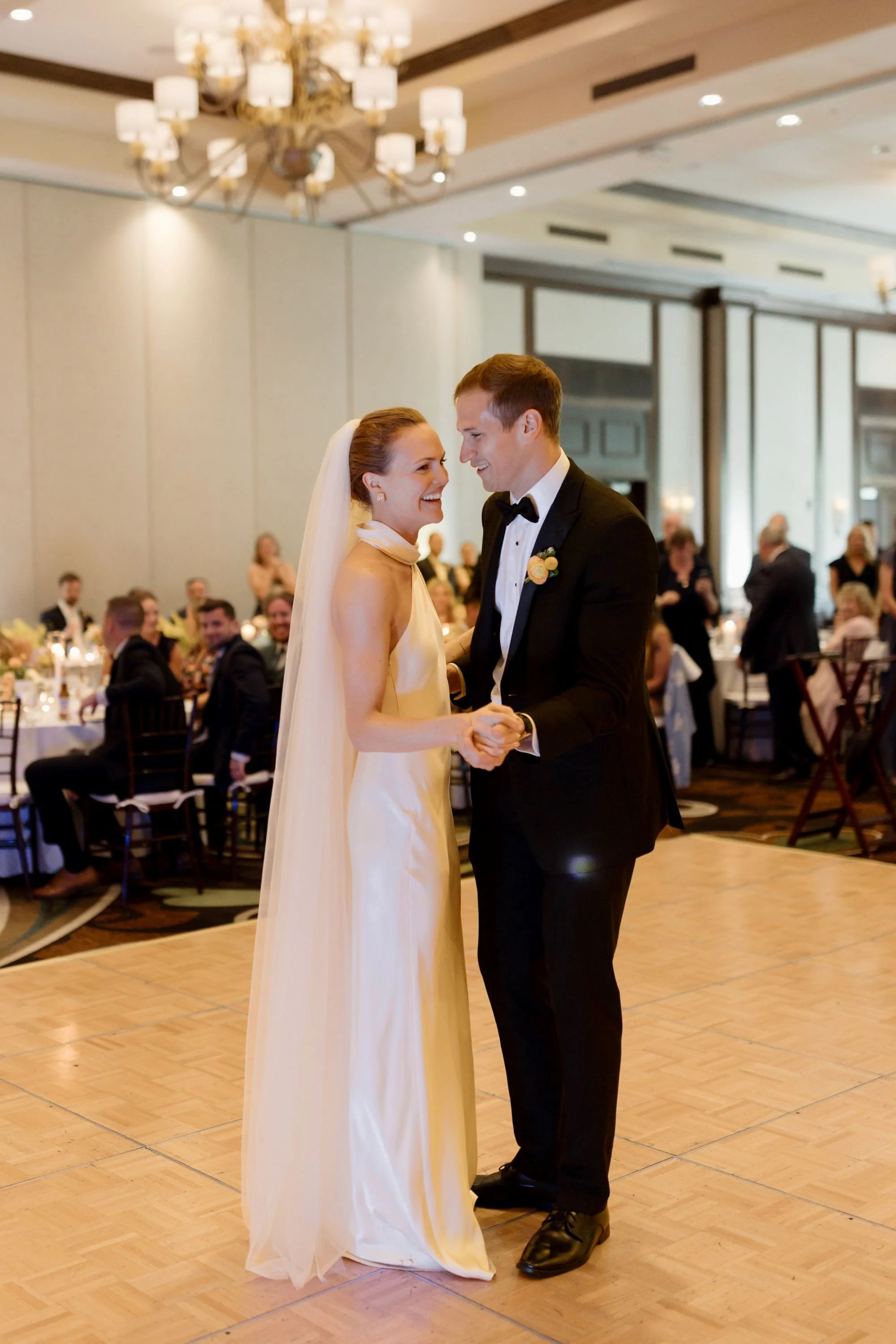 Maggie and Mike’s May Osthoff Resort Wedding featured pretty spring florals, a gorgeous weather day, beautiful portraits, and the most fun dance floor. After getting ready, Maggie had a sweet first look with her dad that was so special! She wore a glamorous dress with a stunning veil and simple, but refined jewelry. Mike donned a dapper tux and the couple had a special first look inside the resort.