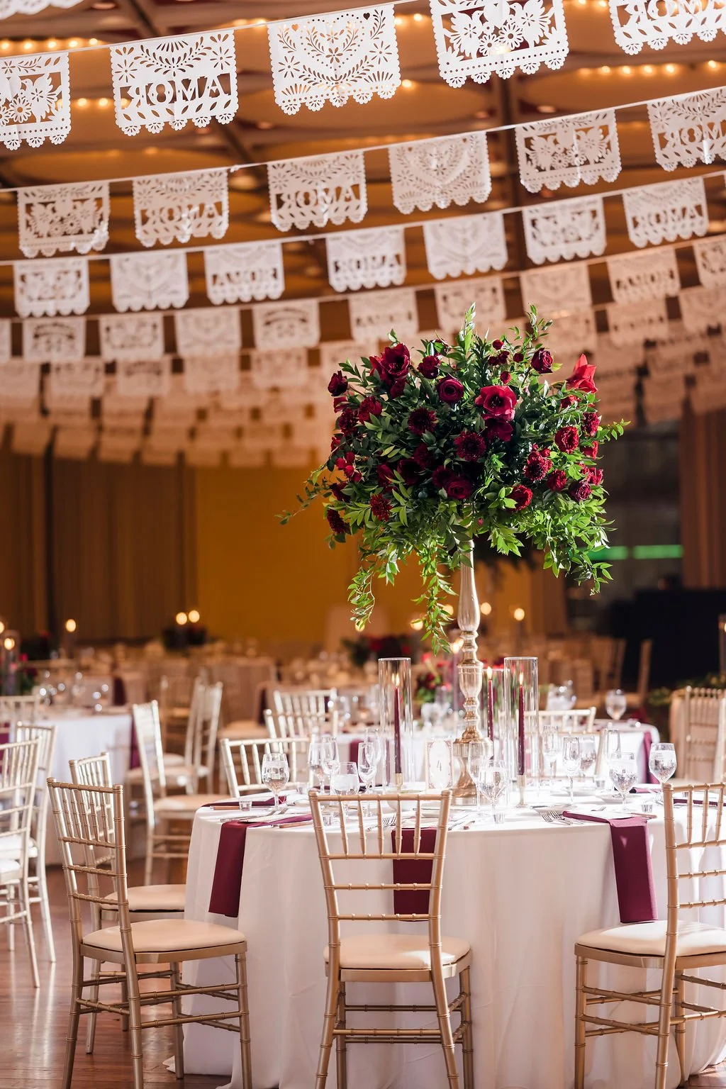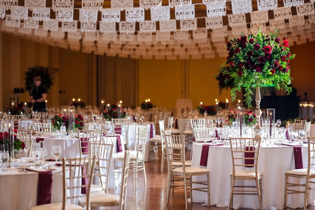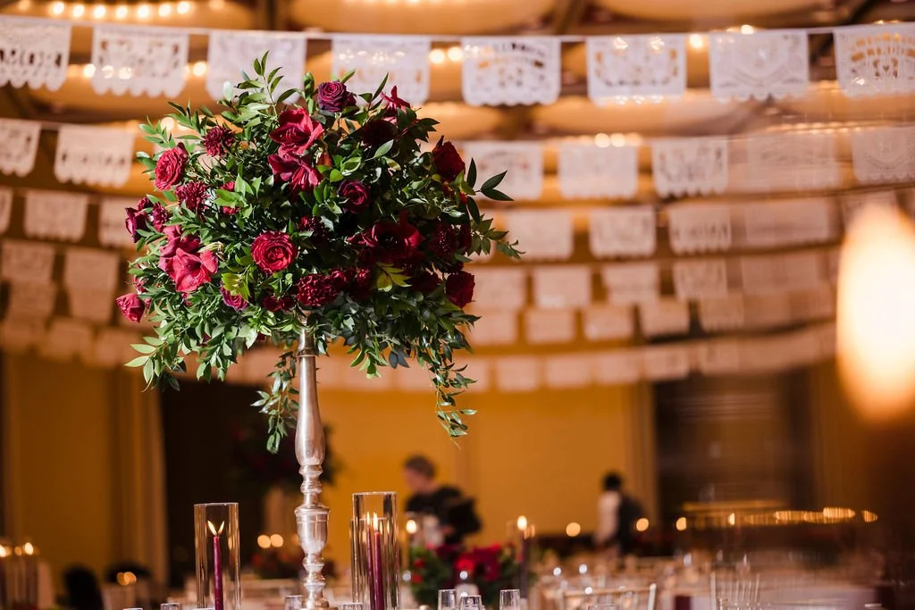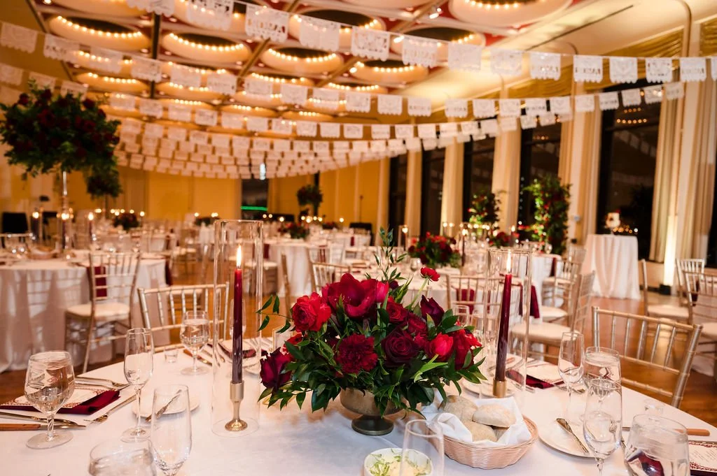 Selene showcased her Mexican culture through the stationery, signage, and papel picado hanging from the ceiling. They also had a mariachi band play at the ceremony and cocktail hour. In addition to the wedding cake and chocolate blueberry pudding, they had a Mexican candy table and some Mexican pastries to enjoy with the coffee. Selene and Alex also incorporated some cultural dances such as the La Vibora de la Mar (snake dance) and a money dance. To honor Alex’s Greek heritage, they handed out Bourbonnais (Jordan almonds) to all of the guests during dinner. Mistletoe was really meaningful to the couple and it was incorporated into the design on the cake.
