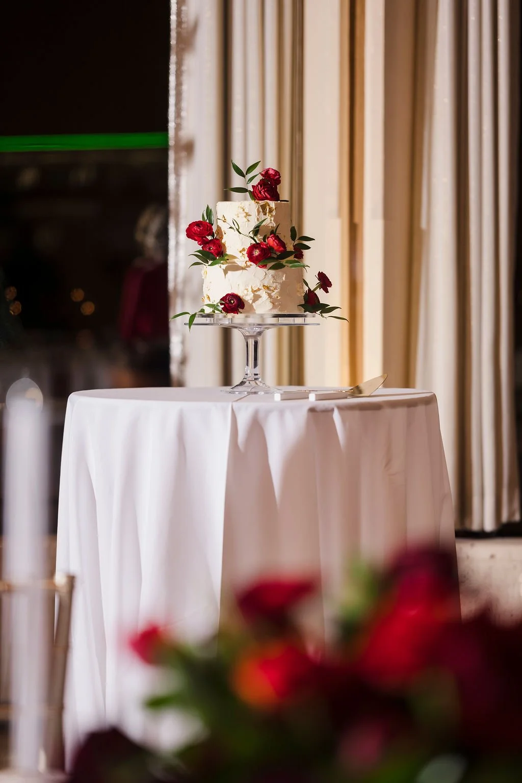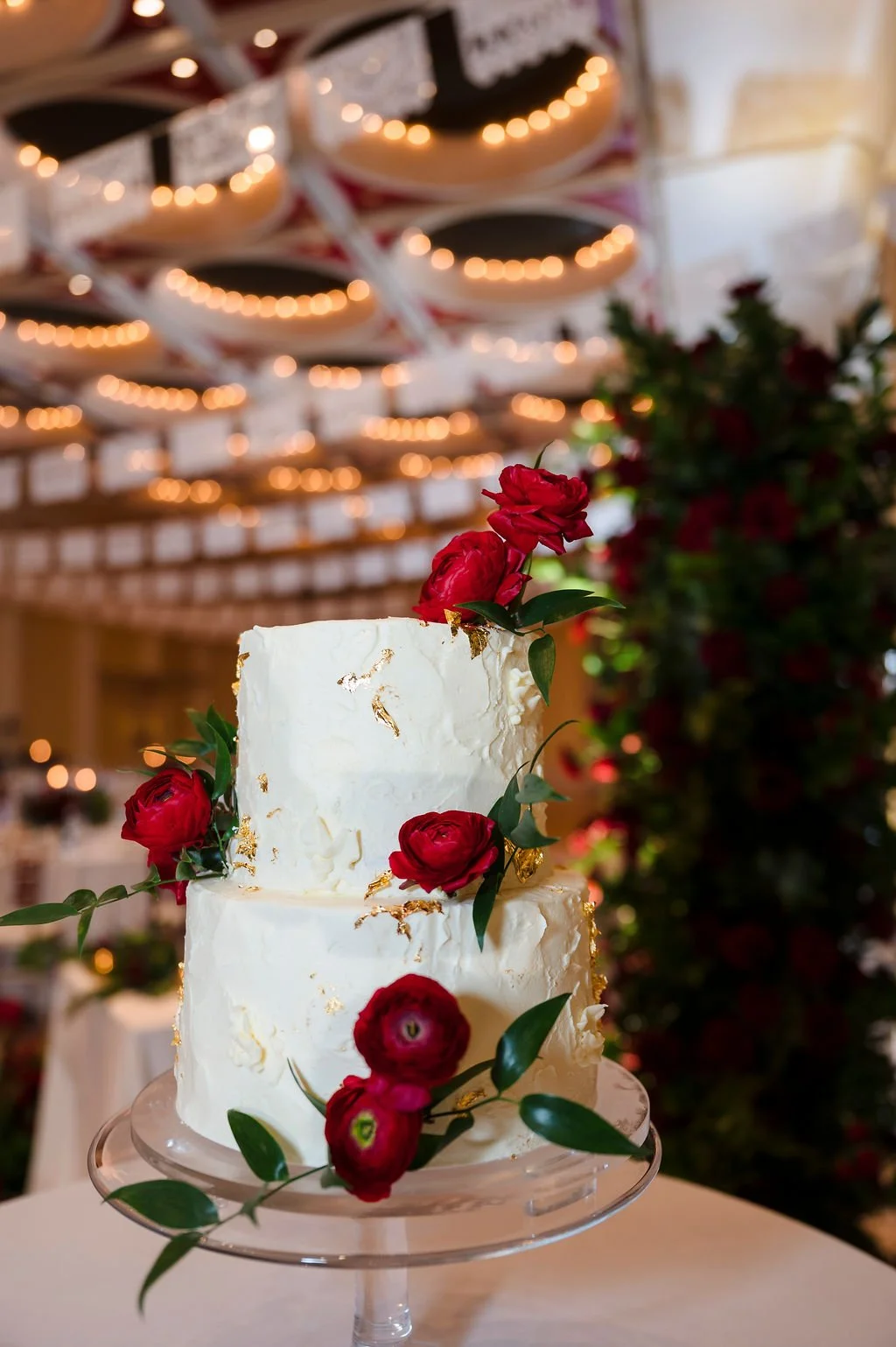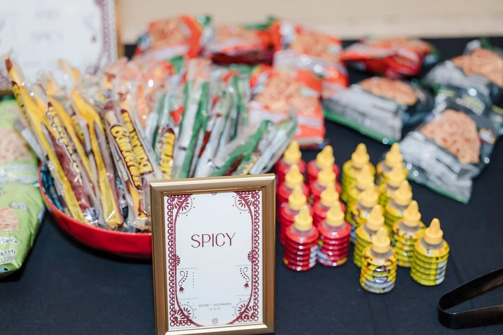 Selene showcased her Mexican culture through the stationery, signage, and papel picado hanging from the ceiling. They also had a mariachi band play at the ceremony and cocktail hour. In addition to the wedding cake and chocolate blueberry pudding, they had a Mexican candy table and some Mexican pastries to enjoy with the coffee. Selene and Alex also incorporated some cultural dances such as the La Vibora de la Mar (snake dance) and a money dance. To honor Alex’s Greek heritage, they handed out Bourbonnais (Jordan almonds) to all of the guests during dinner. Mistletoe was really meaningful to the couple and it was incorporated into the design on the cake.