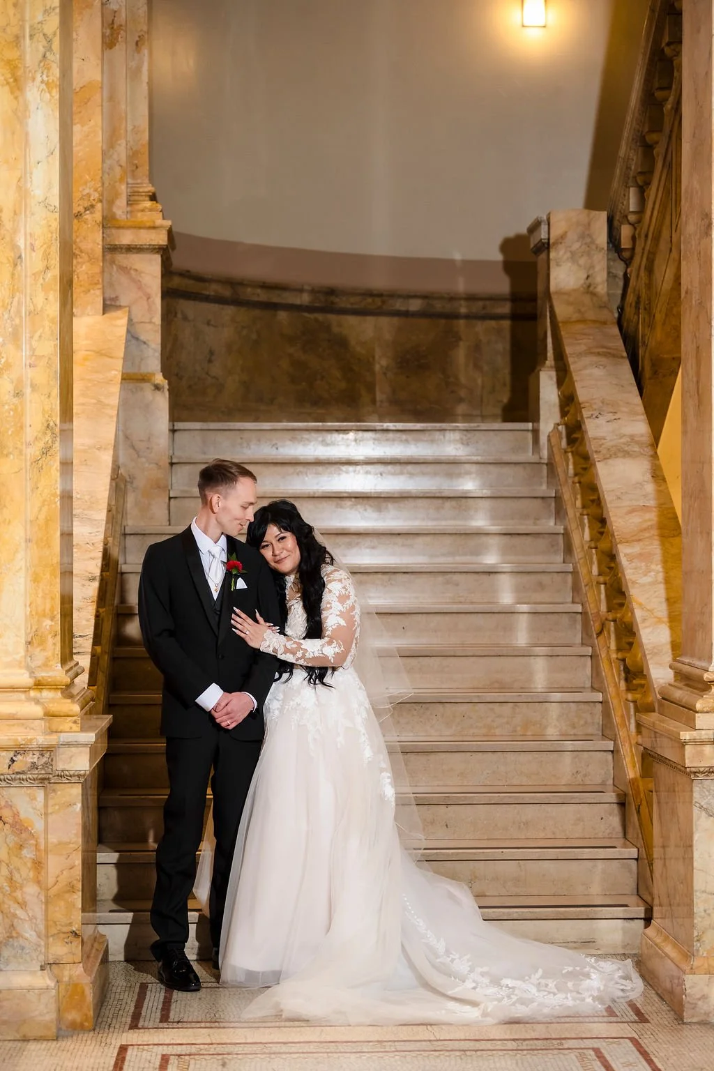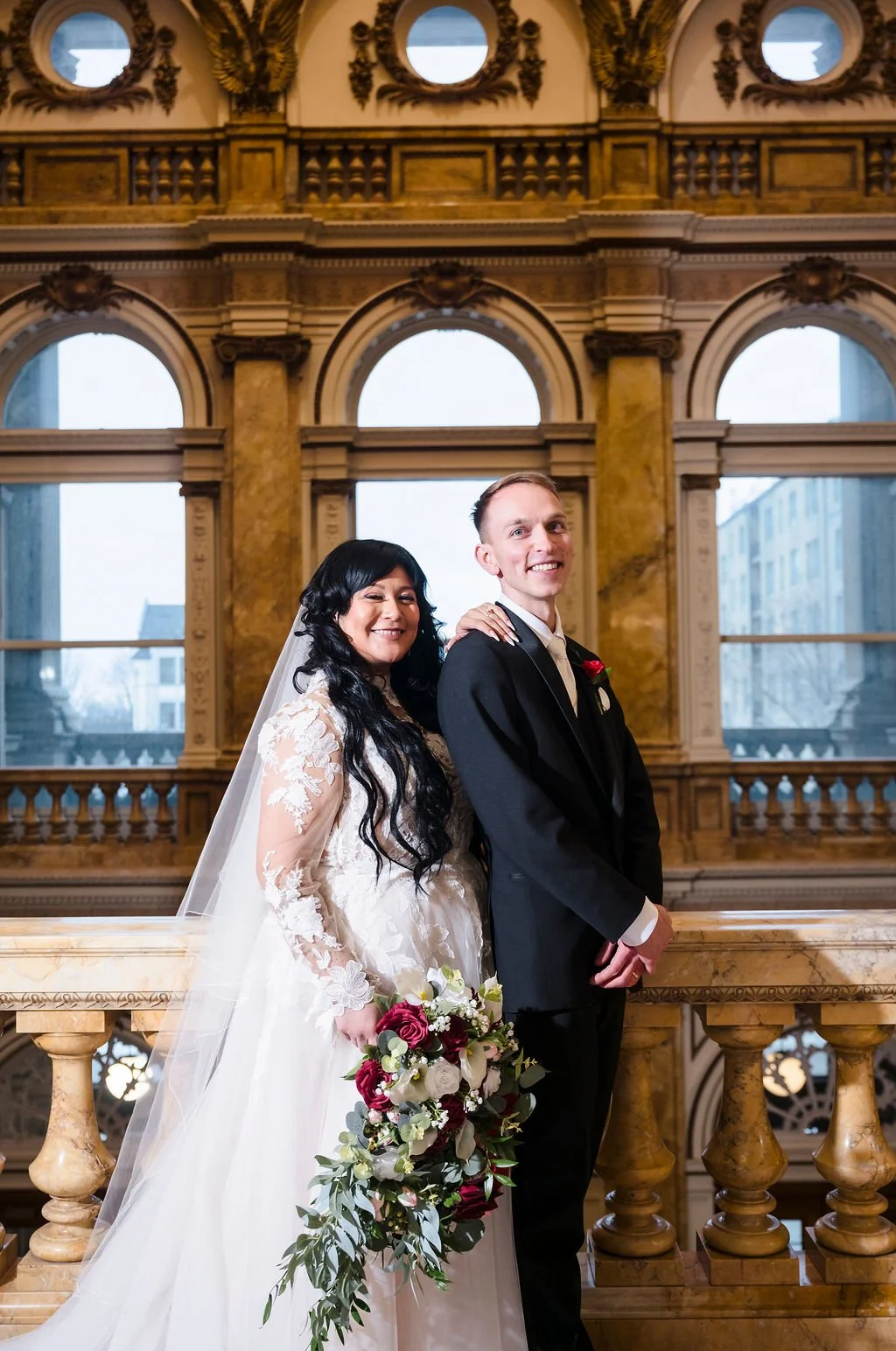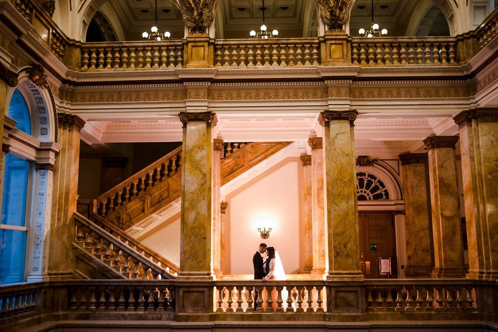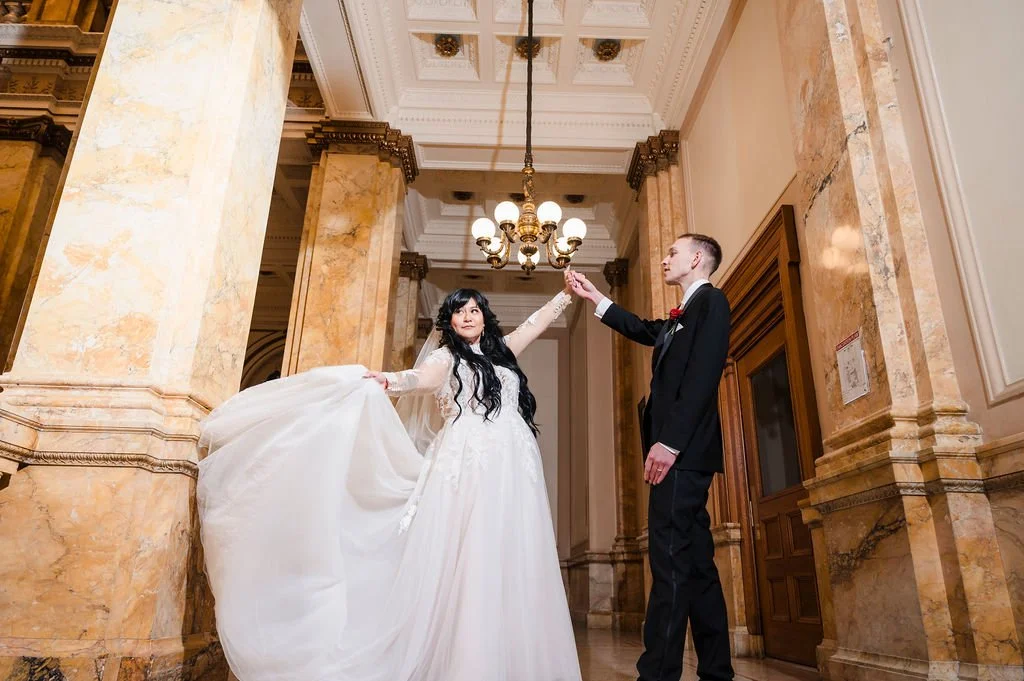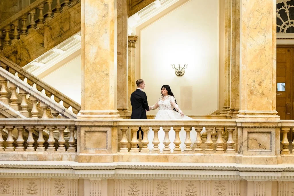 Selene and Alex took wedding portraits at the Milwaukee Central Library and with such grand architecture, the photos really are stunning. You would never guess this Marcus Center wedding was planned in just two months! Cheers to Selene and Alex!