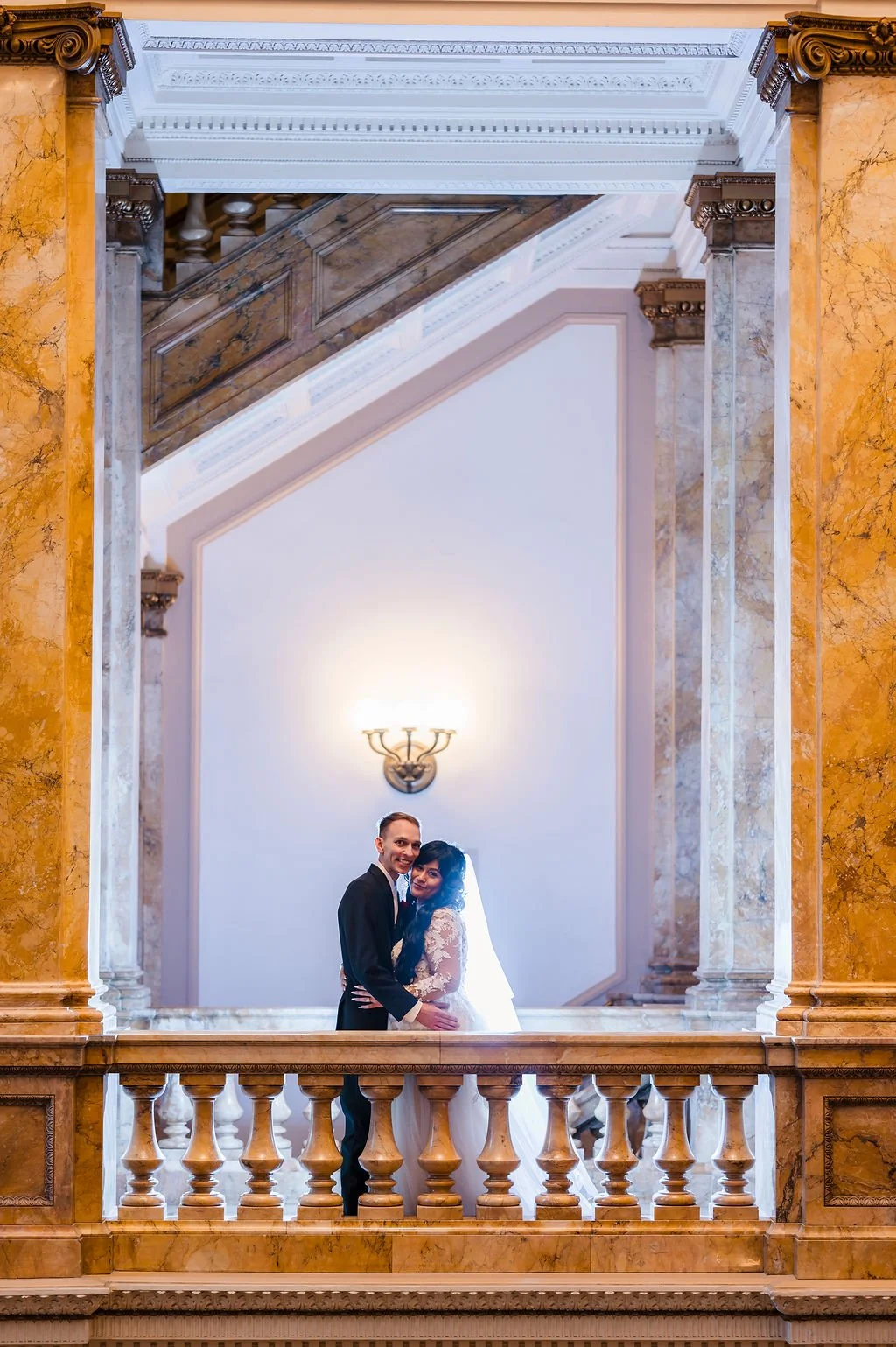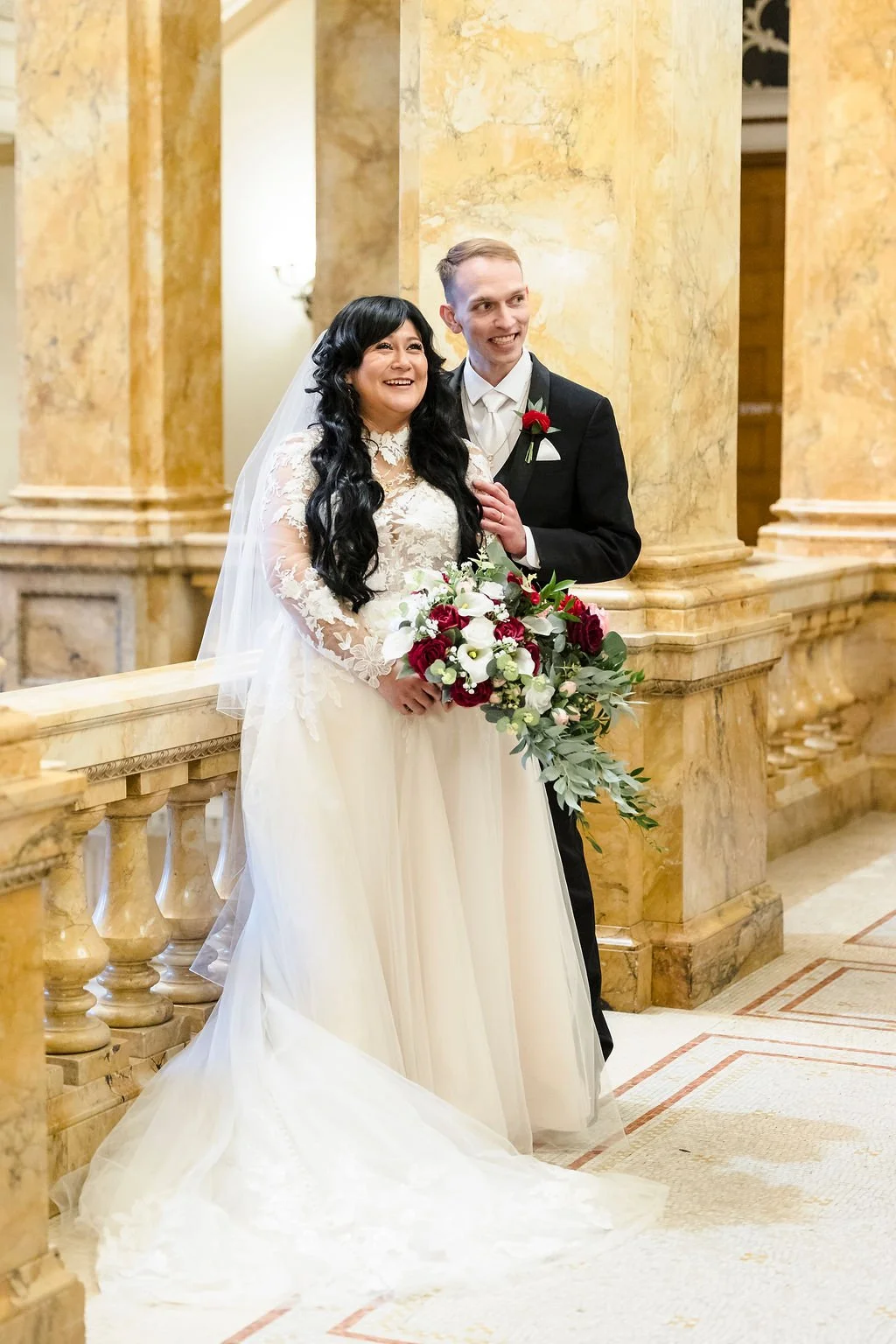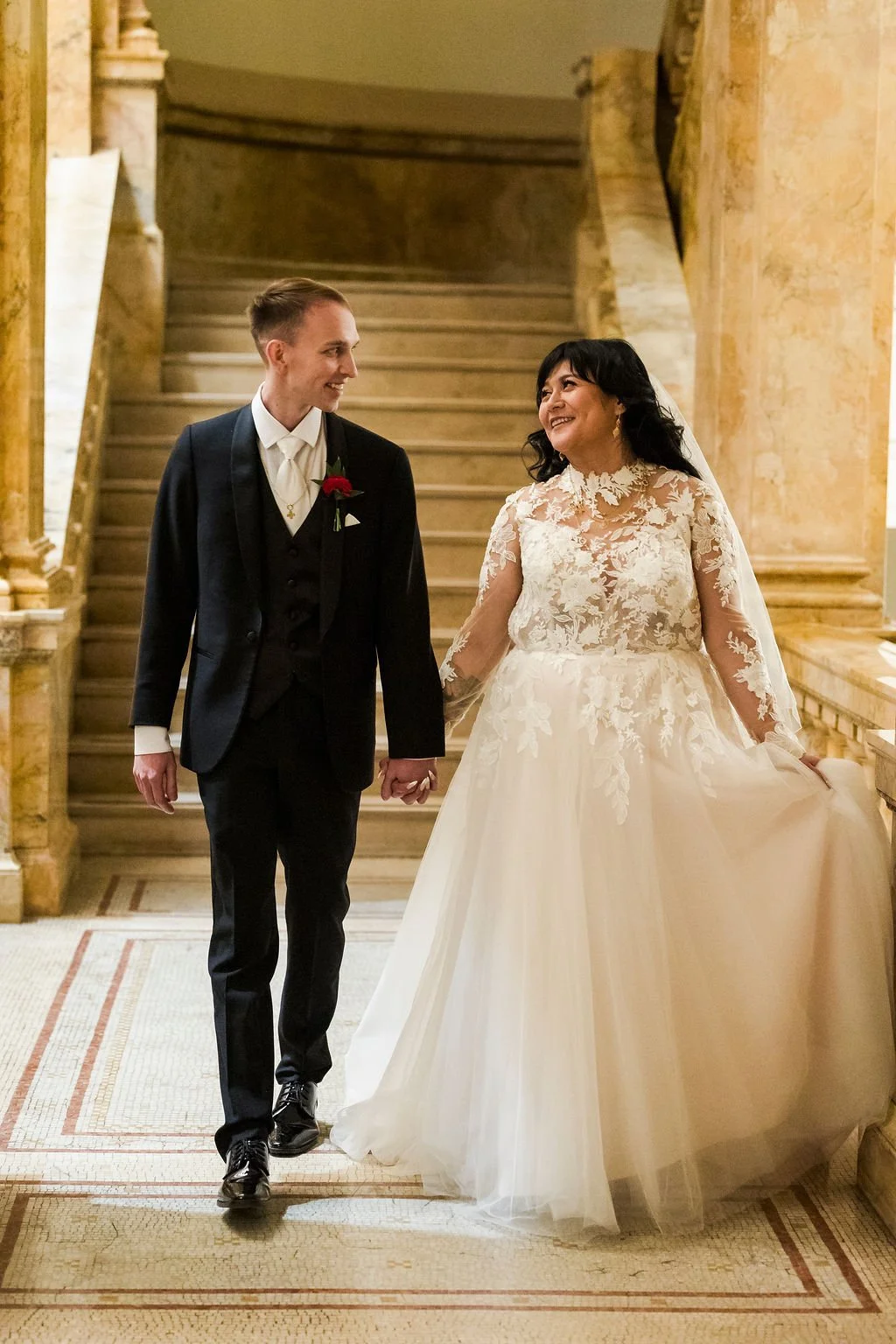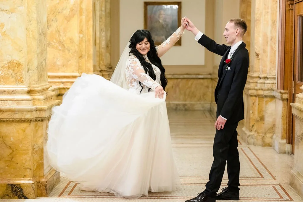 Selene and Alex took wedding portraits at the Milwaukee Central Library and with such grand architecture, the photos really are stunning. You would never guess this Marcus Center wedding was planned in just two months! Cheers to Selene and Alex!