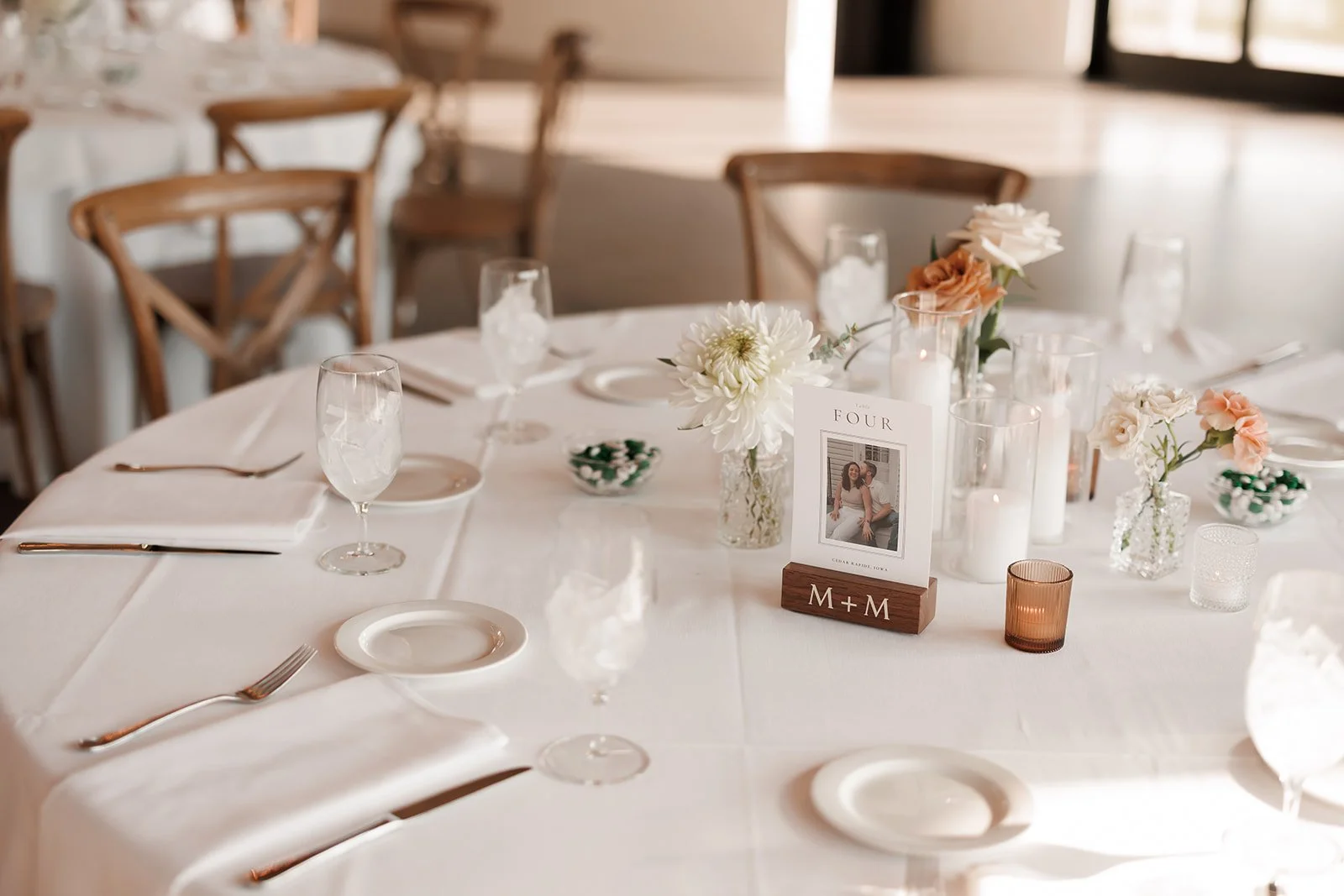 One of the standout aspects of this wedding was the number of custom pieces created by the bride’s brother-in-law. He handcrafted several decor elements for the day, including the welcome sign, seating chart, table number holders, corn hole set, and the stands used to display the ceremony and sweetheart table florals. These personal touches not only looked beautiful but also made the celebration feel extra special.