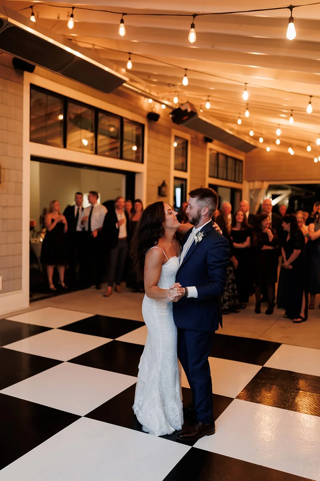 As the evening continued, the celebration moved outdoors where guests enjoyed dancing under the warm night sky. Some guests gathered around the fire table while others spent the evening on the dance floor, creating a relaxed outdoor party atmosphere that perfectly matched the beautiful weather.