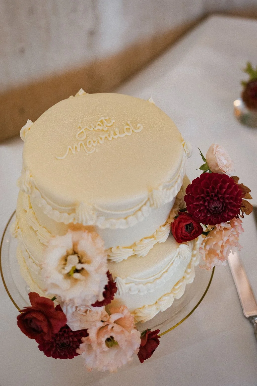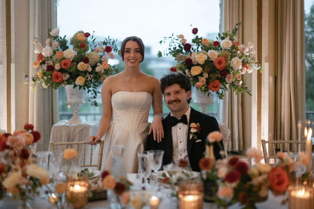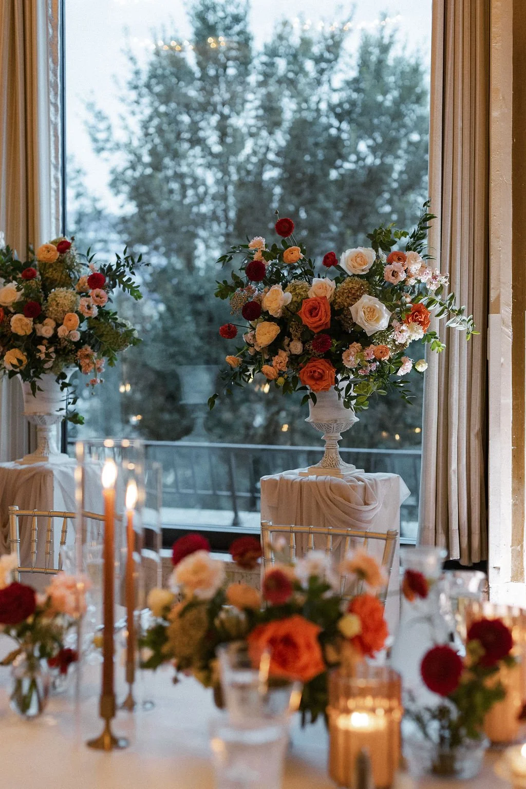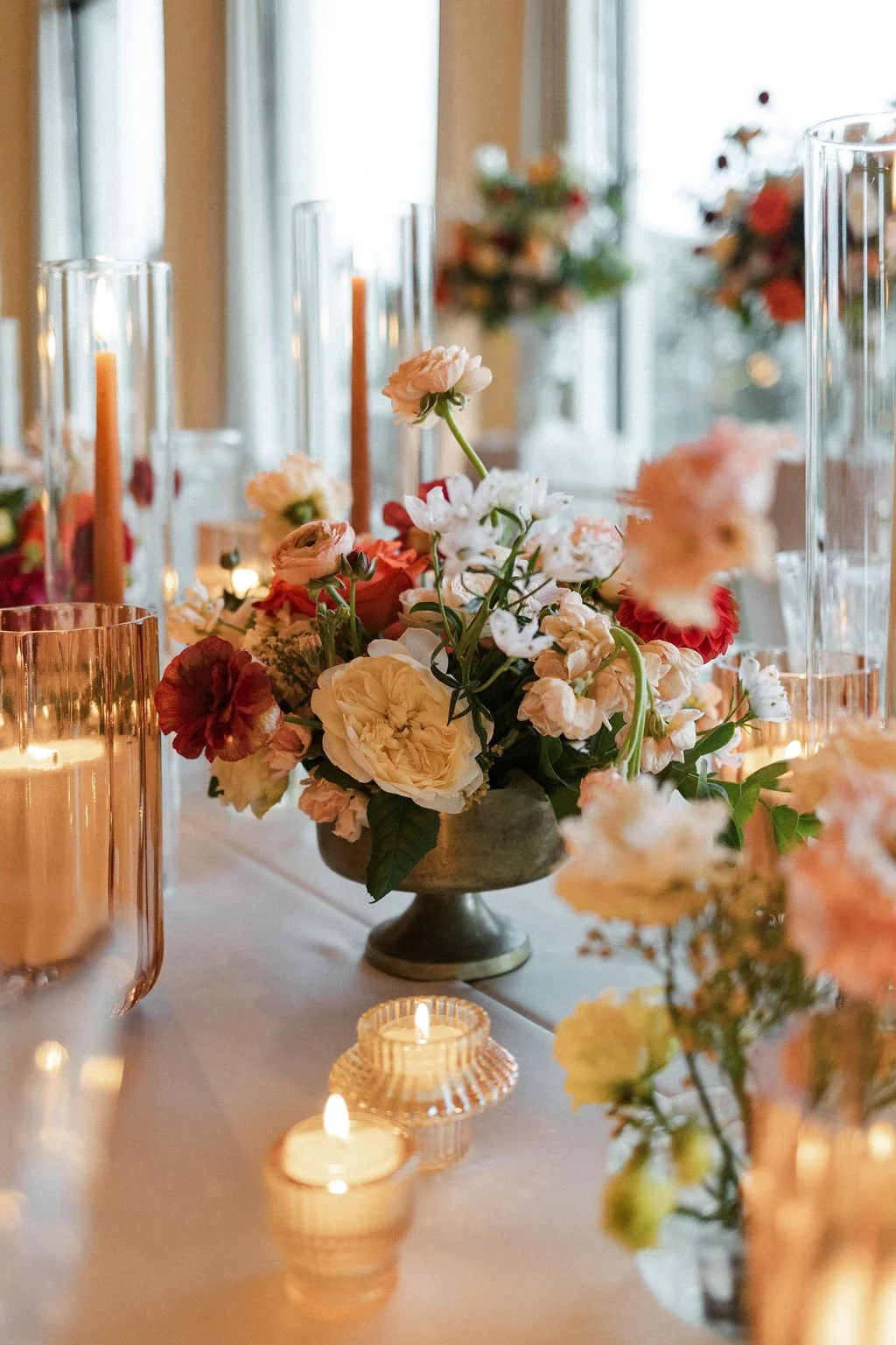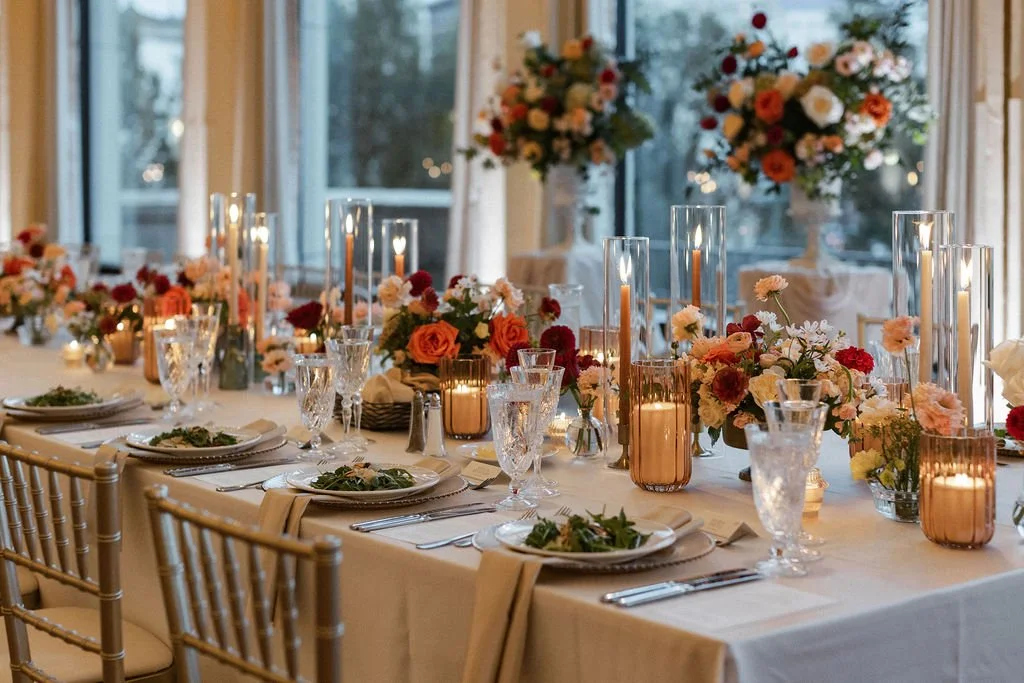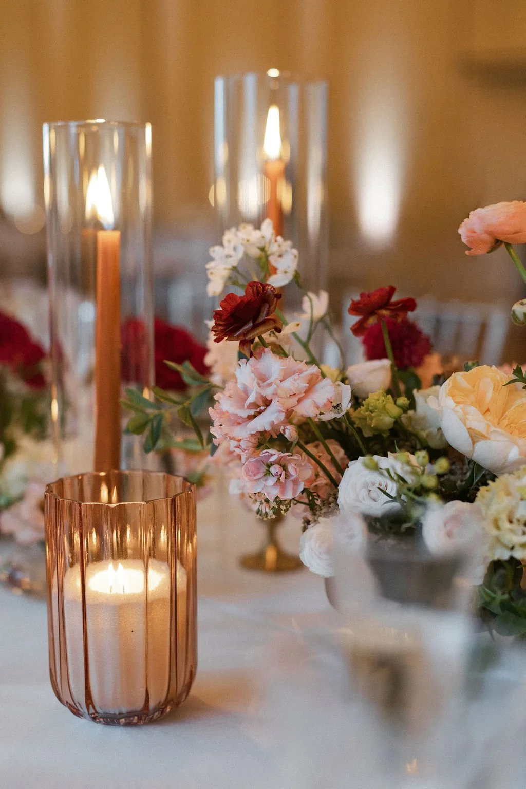 Cocktail hour transitioned naturally into the reception, where the design leaned into early fall. Florals carried warm, seasonal tones, layered throughout the space in a way that felt cohesive without being overly structured. Candlelight added depth and softness as the evening continued, creating an atmosphere that felt both inviting and elevated.