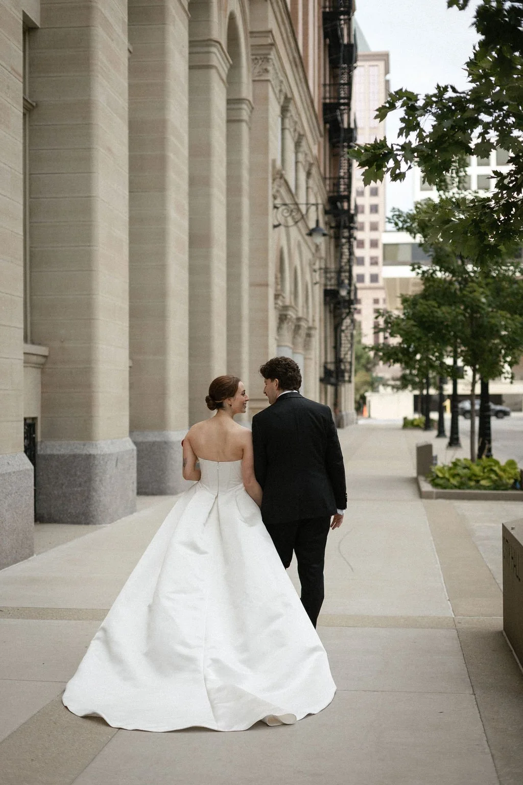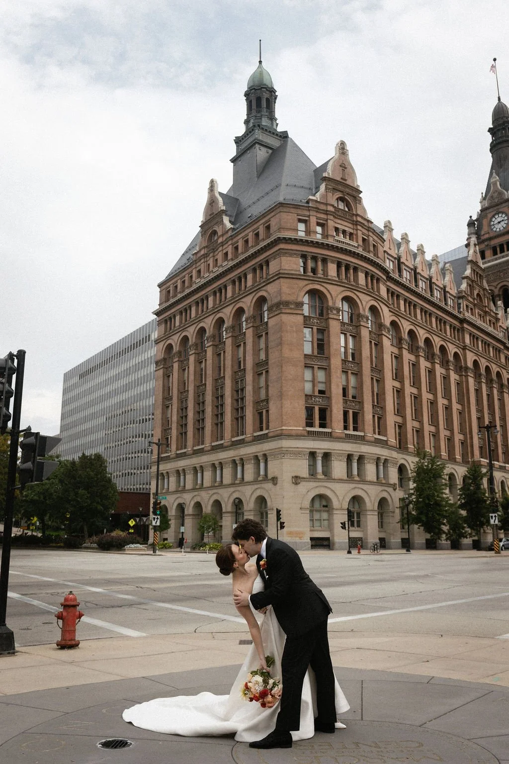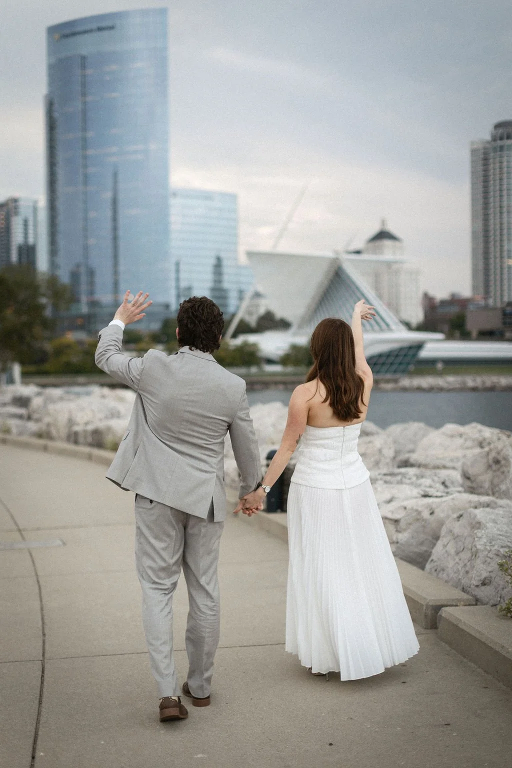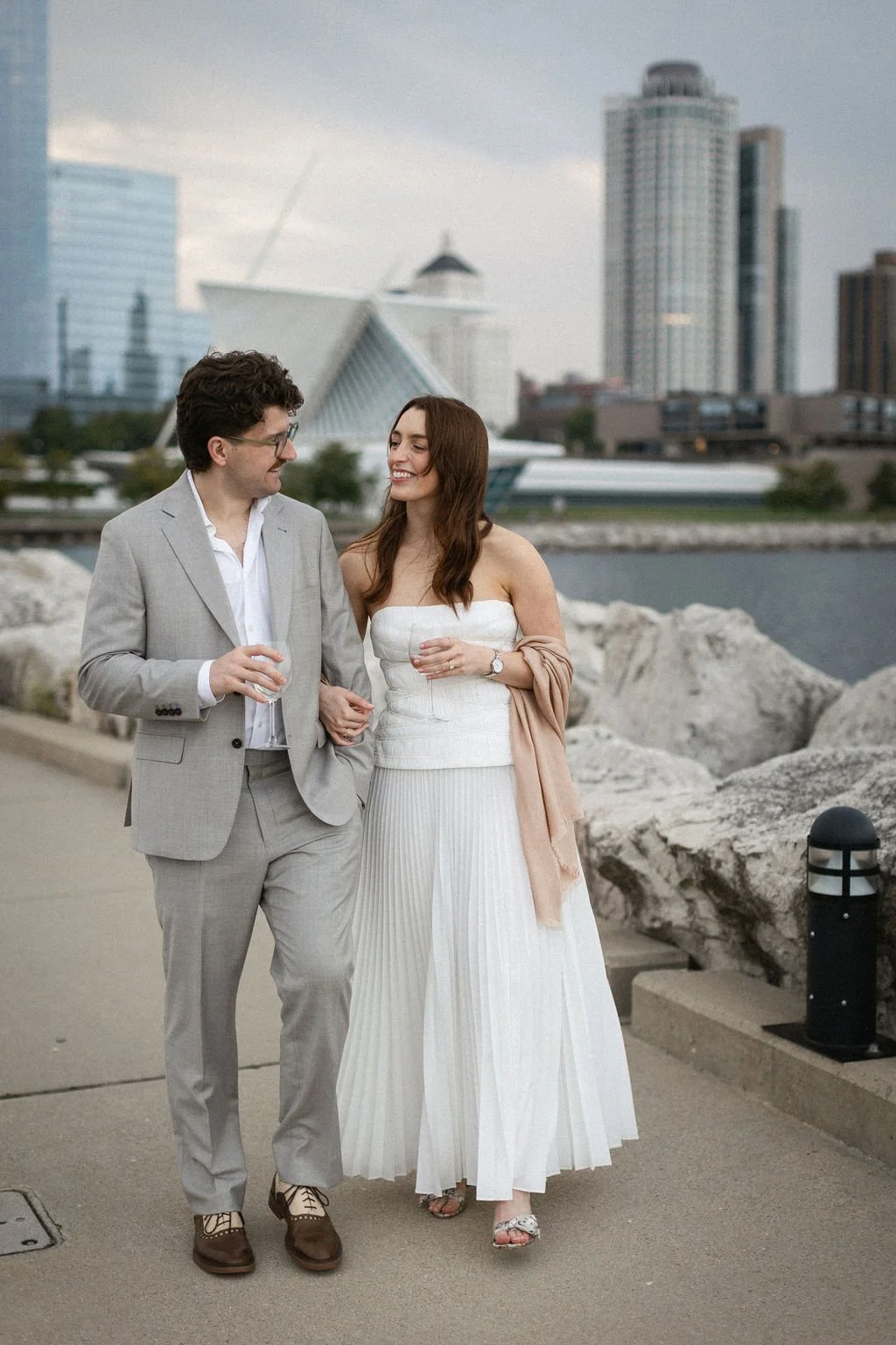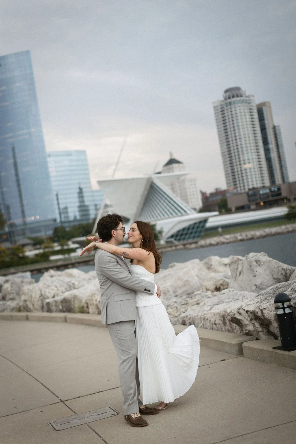 On the wedding day, everything moved with intention from the very beginning. The morning was spent getting ready, followed by a first look that allowed them to step away together before the day fully began. From there, they explored the city for portraits, taking advantage of Milwaukee’s architecture and lakefront for a series of photographs that felt both modern and distinctly personal.
