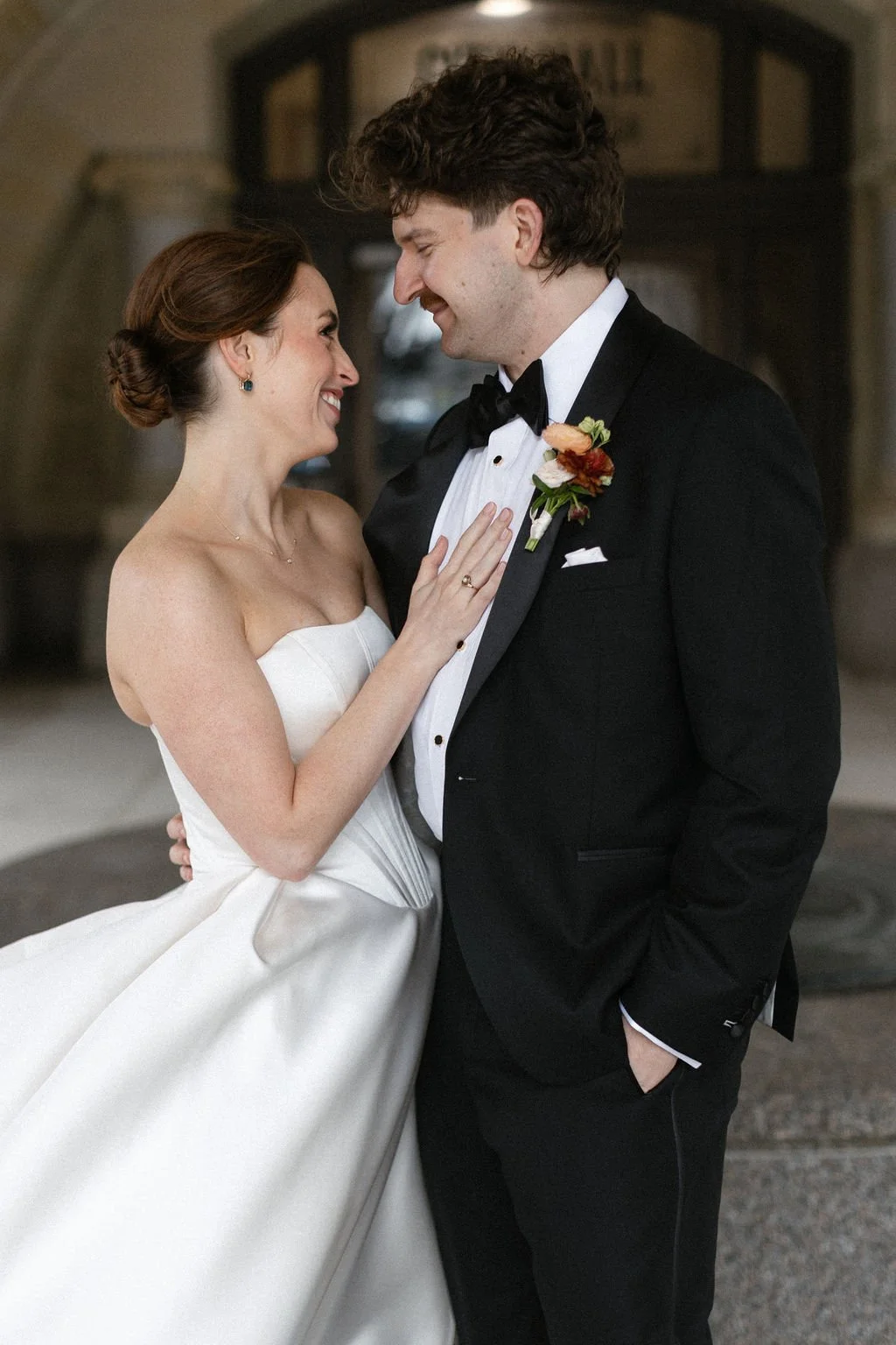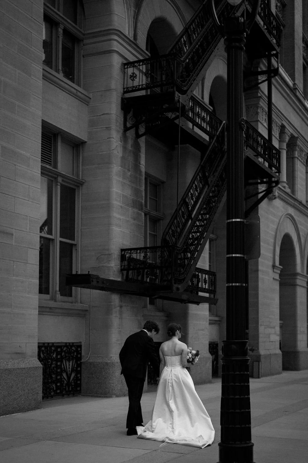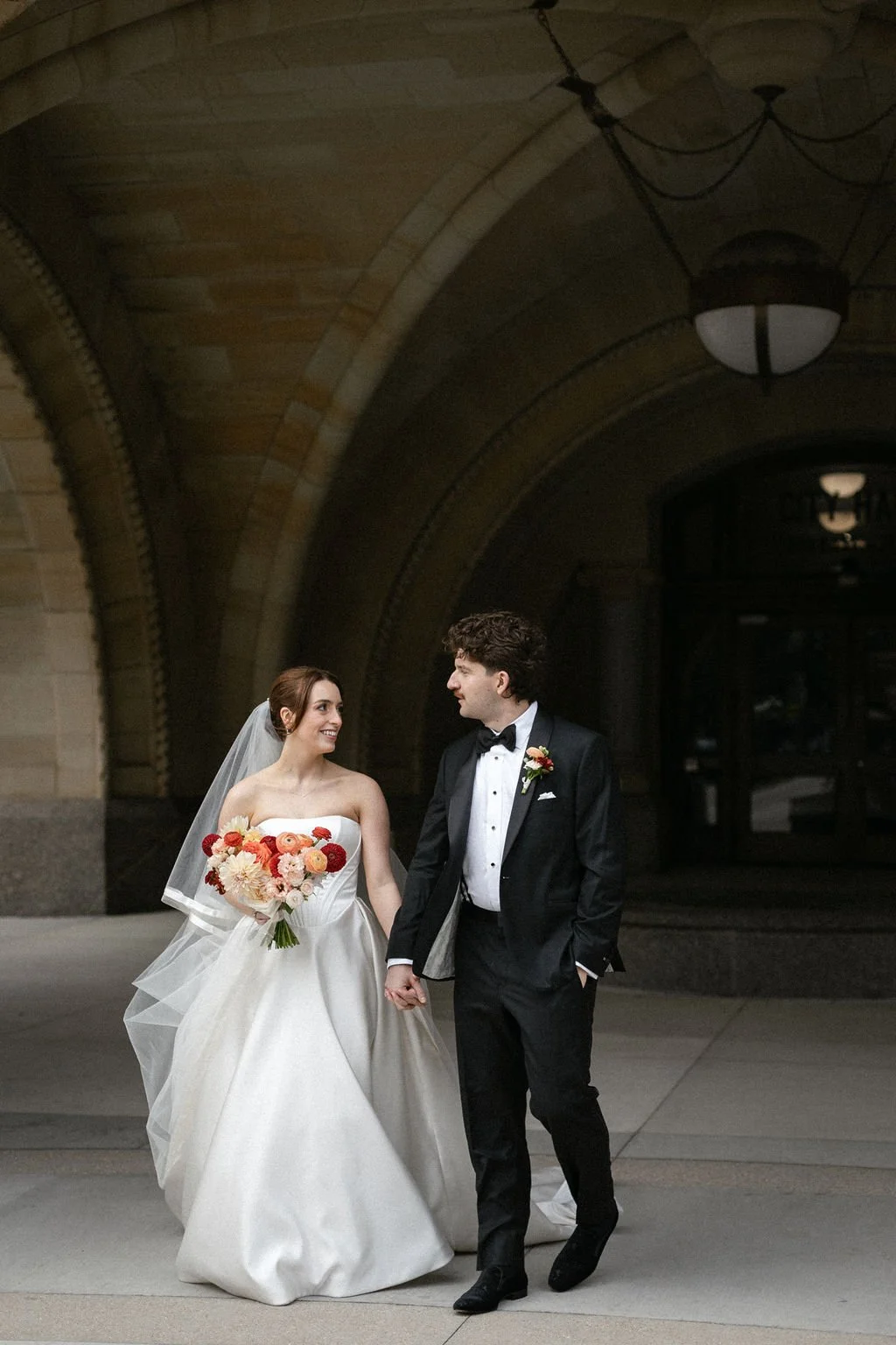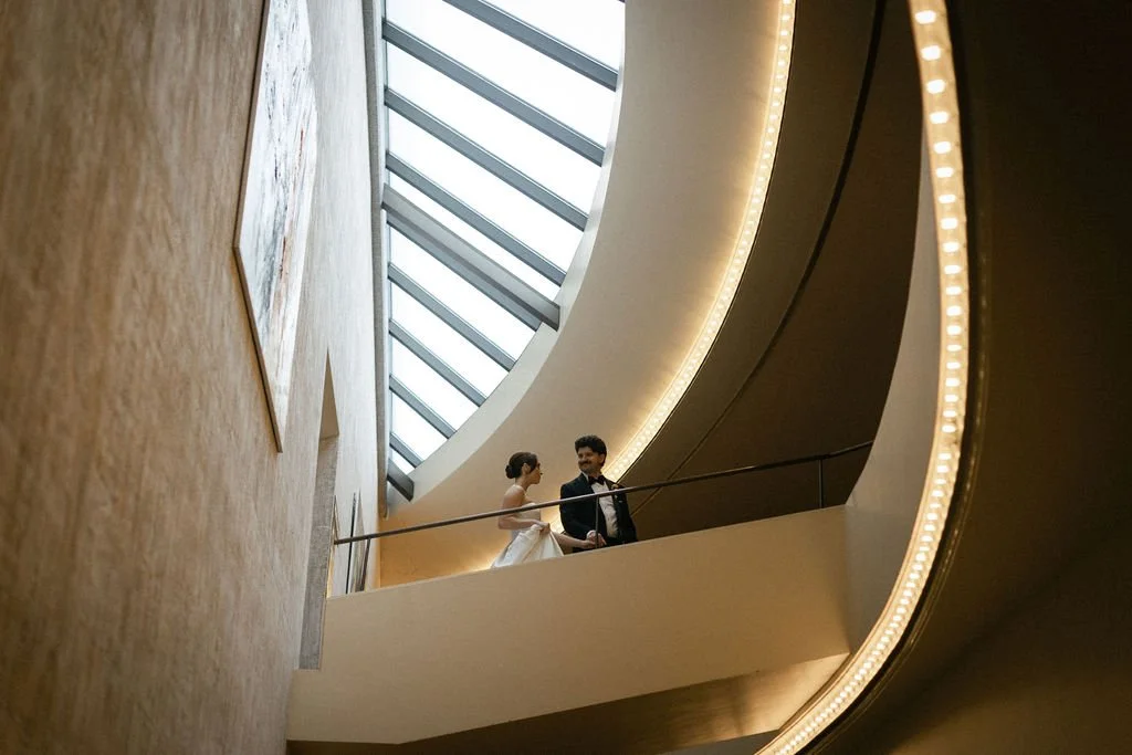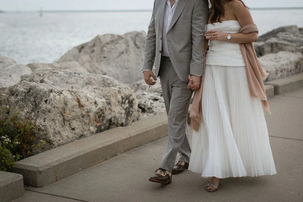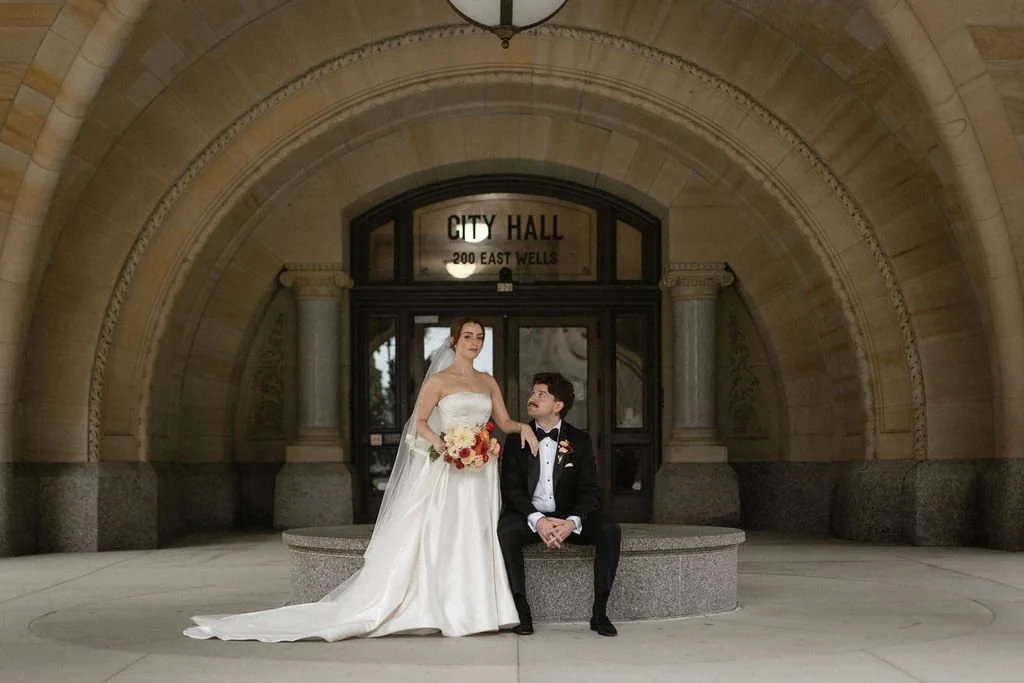 On the wedding day, everything moved with intention from the very beginning. The morning was spent getting ready, followed by a first look that allowed them to step away together before the day fully began. From there, they explored the city for portraits, taking advantage of Milwaukee’s architecture and lakefront for a series of photographs that felt both modern and distinctly personal.