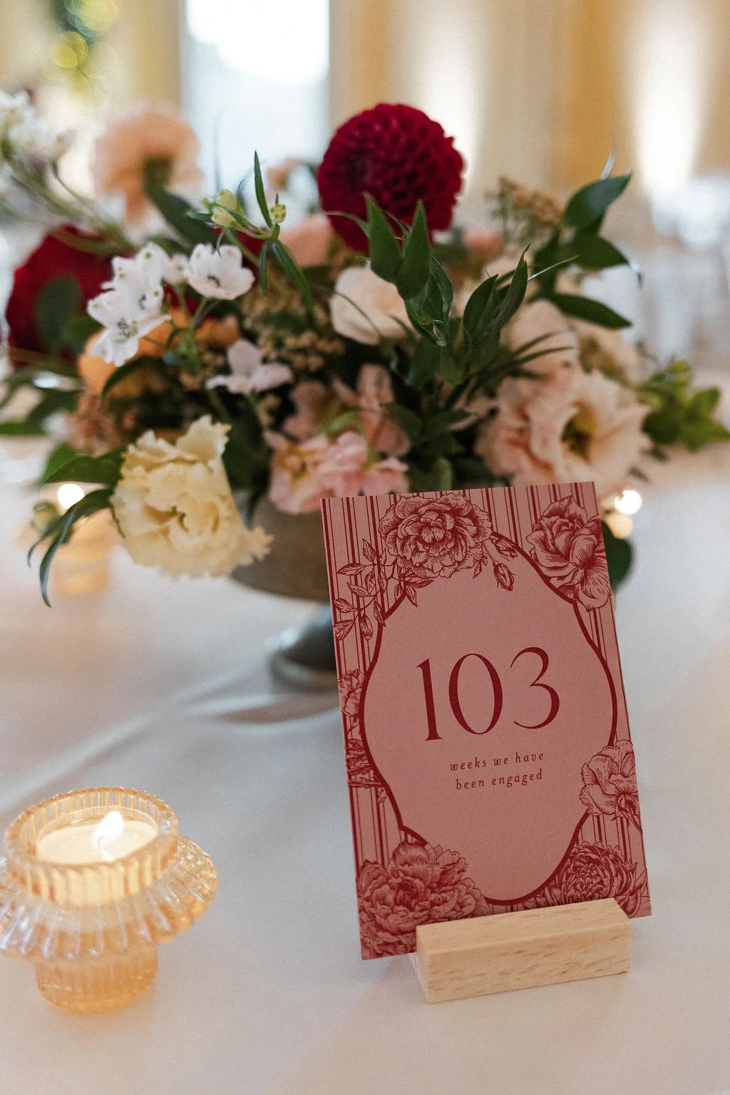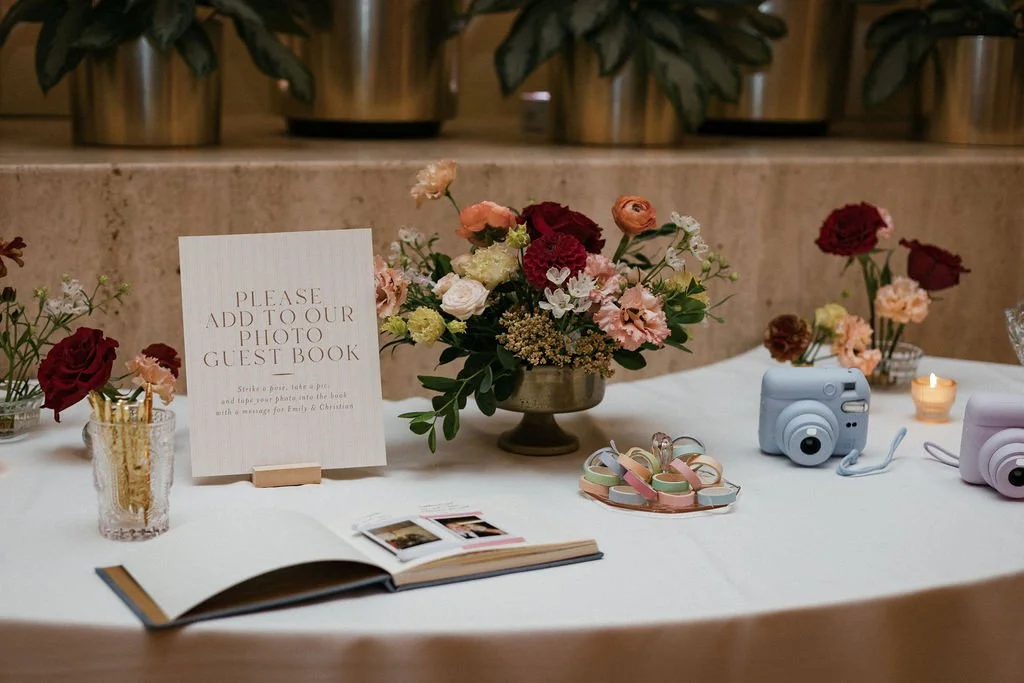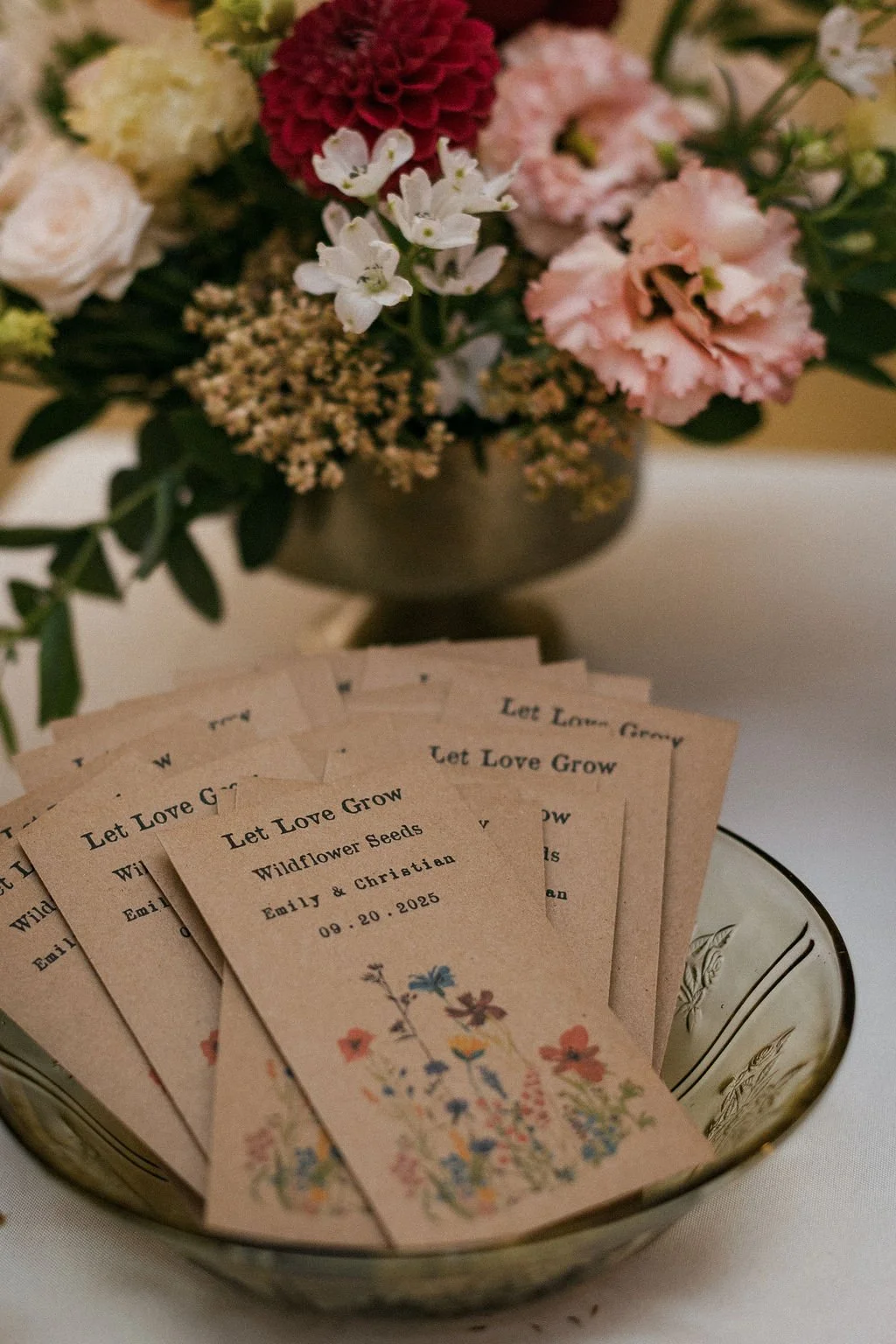 There were also a number of personal details woven in throughout the celebration. Their table numbers reflected meaningful milestones, marking the number of weeks tied to significant moments in their relationship. Guests were invited to participate in a Polaroid guest book, capturing candid photos of themselves alongside handwritten notes. Favors were simple and thoughtful: packets of flower seeds with the phrase “let love grow,” a small gesture that carried forward the tone of the day.